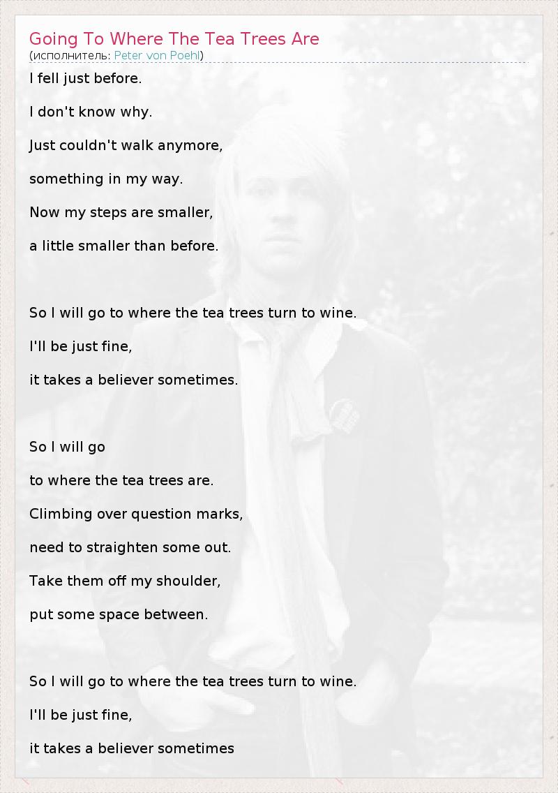 I fell just before. I don't know why. Just couldn't walk anymore, something in my way. Now my steps are smaller, a little smaller than before. So I will go to where the tea trees turn to wine. I'll be just fine, it takes a believer sometimes. So I will go to where the tea trees are. Climbing over question marks, need to straighten some out. Take them off my shoulder, put some space between. So I will go to where the tea trees turn to wine. I'll be just fine, it takes a believer sometimes