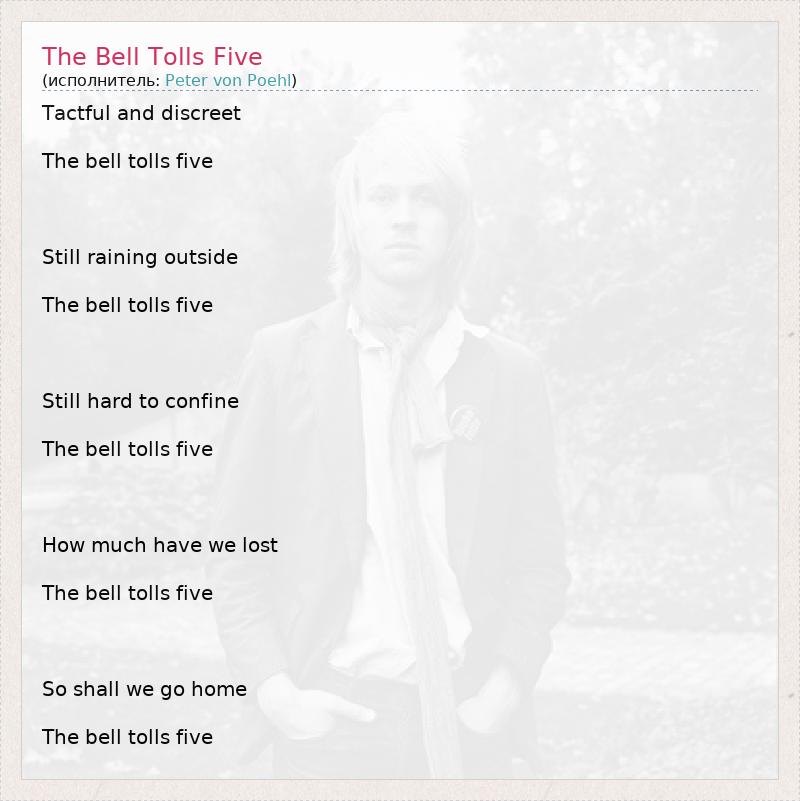 Tactful and discreet The bell tolls five Still raining outside The bell tolls five Still hard to confine The bell tolls five How much have we lost The bell tolls five So shall we go home The bell tolls five
