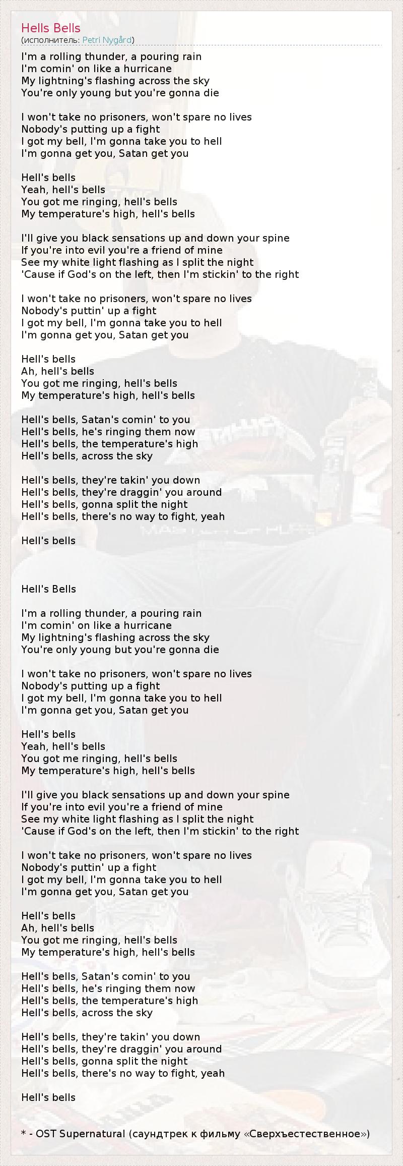 I'm a rolling thunder, a pouring rain I'm comin' on like a hurricane My lightning's flashing across the sky You're only young but you're gonna die I won't take no prisoners, won't spare no lives Nobody's putting up a fight I got my bell, I'm gonna take you to hell I'm gonna get you, Satan get you Hell's bells Yeah, hell's bells You got me ringing, hell's bells My temperature's high, hell's bells I'll give you black sensations up and down your spine If you're into evil you're a friend of mine See my white light flashing as I split the night 'Cause if God's on the left, then I'm stickin' to the right I won't take no prisoners, won't spare no lives Nobody's puttin' up a fight I got my bell, I'm gonna take you to hell I'm gonna get you, Satan get you Hell's bells Ah, hell's bells You got me ringing, hell's bells My temperature's high, hell's bells Hell's bells, Satan's comin' to you Hell's bells, he's ringing them now Hell's bells, the temperature's high Hell's bells, across the sky Hell's bells, they're takin' you down Hell's bells, they're draggin' you around Hell's bells, gonna split the night Hell's bells, there's no way to fight, yeah Hell's bells Hell's Bells I'm a rolling thunder, a pouring rain I'm comin' on like a hurricane My lightning's flashing across the sky You're only young but you're gonna die I won't take no prisoners, won't spare no lives Nobody's putting up a fight I got my bell, I'm gonna take you to hell I'm gonna get you, Satan get you Hell's bells Yeah, hell's bells You got me ringing, hell's bells My temperature's high, hell's bells I'll give you black sensations up and down your spine If you're into evil you're a friend of mine See my white light flashing as I split the night 'Cause if God's on the left, then I'm stickin' to the right I won't take no prisoners, won't spare no lives Nobody's puttin' up a fight I got my bell, I'm gonna take you to hell I'm gonna get you, Satan get you Hell's bells Ah, hell's bells You got me ringing, hell's bells My temperature's high, hell's bells Hell's bells, Satan's comin' to you Hell's bells, he's ringing them now Hell's bells, the temperature's high Hell's bells, across the sky Hell's bells, they're takin' you down Hell's bells, they're draggin' you around Hell's bells, gonna split the night Hell's bells, there's no way to fight, yeah Hell's bells * - OST Supernatural (саундтрек к фильму «Сверхъестественное»)