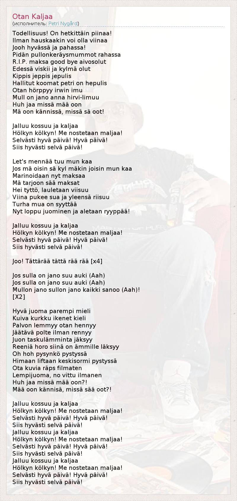 Todellisuus! On hetkittäin piinaa! Ilman hauskaakin voi olla viinaa Jooh hyvässä ja pahassa! Pidän pullonkeräysmummot rahassa R.I.P. maksa good bye aivosolut Edessä viskii ja kylmä olut Kippis jeppis jepulis Hallitut koomat petri on hepulis Otan hörppyy irwin imu Mull on jano anna hirvi-limuu Huh jaa missä mää oon Mä oon kännissä, missä sä oot! Jalluu kossuu ja kaljaa Hölkyn kölkyn! Me nostetaan maljaa! Selvästi hyvä päivä! Hyvä päivä! Siis hyvästi selvä päivä! Let's mennää tuu mun kaa Jos mä oisin sä kyl mäkin joisin mun kaa Marinoidaan nyt maksaa Mä tarjoon sää maksat Hei tyttö, lauletaan viisuu Viina pukee sua ja yleensä riisuu Turha mua on syyttää Nyt loppu juominen ja aletaan ryyppää! Jalluu kossuu ja kaljaa Hölkyn kölkyn! Me nostetaan maljaa! Selvästi hyvä päivä! Hyvä päivä! Siis hyvästi selvä päivä! Joo! Tättärää tättä rää rää [x4] Jos sulla on jano suu auki (Aah) Jos sulla on jano suu auki (Aah) Mullon jano sullon jano kaikki sanoo (Aah)! [X2] Hyvä juoma parempi mieli Kuiva kurkku ikenet kieli Palvon lemmyy otan hennyy Jäätävä polte ilman rennyy Juon taskulämminta jäksyy Reeniä horo siinä on ämmille läksyy Oh hoh pysynkö pystyssä Himaan liftaan keskisormi pystyssä Ota kuvia räps filmaten Lempijuoma, no vittu ilmanen Huh jaa missä mää oon?! Mää oon kännisä, missä sää oot?! Jalluu kossuu ja kaljaa Hölkyn kölkyn! Me nostetaan maljaa! Selvästi hyvä päivä! Hyvä päivä! Siis hyvästi selvä päivä! Jalluu kossuu ja kaljaa Hölkyn kölkyn! Me nostetaan maljaa! Selvästi hyvä päivä! Hyvä päivä! Siis hyvästi selvä päivä! Jalluu kossuu ja kaljaa Hölkyn kölkyn! Me nostetaan maljaa! Selvästi hyvä päivä! Hyvä päivä! Siis hyvästi selvä päivä!