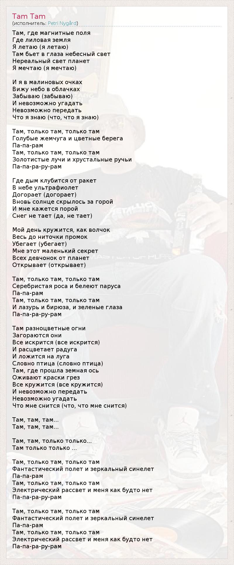 Там, где магнитные поля Где лиловая земля Я летаю (я летаю) Там бьет в глаза небесный свет Нереальный свет планет Я мечтаю (я мечтаю) И я в малиновых очках Вижу небо в облачках Забываю (забываю) И невозможно угадать Невозможно передать Что я знаю (что, что я знаю) Там, только там, только там Голубые жемчуга и цветные берега Па-па-рам Там, только там, только там Золотистые лучи и хрустальные ручьи Па-па-ра-ру-рам Где дым клубится от ракет В небе ультрафиолет Догорает (догорает) Вновь солнце скрылось за горой И мне кажется порой Снег не тает (да, не тает) Мой день кружится, как волчок Весь до ниточки промок Убегает (убегает) Мне этот маленький секрет Всех девчонок от планет Открывает (открывает) Там, только там, только там Серебристая роса и белеют паруса Па-па-рам Там, только там, только там И лазурь и бирюза, и зеленые глаза Па-па-ра-ру-рам Там разноцветные огни Загораются они Все искрится (все искрится) И расцветает радуга И ложится на луга Словно птица (словно птица) Там, где прошла земная ось Оживают краски грез Все кружится (все кружится) И невозможно передать Невозможно угадать Что мне снится (что, что мне снится) Там, там, там... Там, там, там... Там, там, только только... Там только только ... Там, только там, только там Фантастический полет и зеркальный синелет Па-па-рам Там, только там, только там Электрический рассвет и меня как будто нет Па-па-ра-ру-рам Там, только там, только там Фантастический полет и зеркальный синелет Па-па-рам Там, только там, только там Электрический рассвет и меня как будто нет Па-па-ра-ру-рам