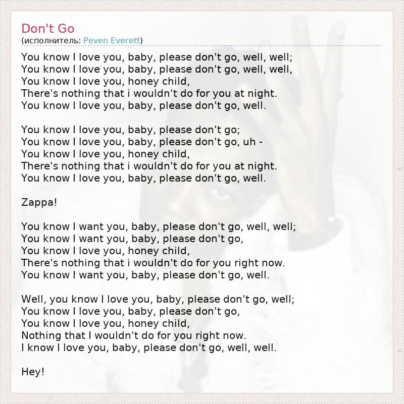 You know I love you, baby, please don't go, well, well; You know I love you, baby, please don't go, well, well, You know I love you, honey child, There's nothing that i wouldn't do for you at night. You know I love you, baby, please don't go, well. You know I love you, baby, please don't go; You know I love you, baby, please don't go, uh - You know I love you, honey child, There's nothing that i wouldn't do for you at night. You know I love you, baby, please don't go, well. Zappa! You know I want you, baby, please don't go, well, well; You know I want you, baby, please don't go, You know I love you, honey child, There's nothing that i wouldn't do for you right now. You know I want you, baby, please don't go, well. Well, you know I love you, baby, please don't go, well; You know I love you, baby, please don't go, You know I love you, honey child, Nothing that I wouldn't do for you right now. I know I love you, baby, please don't go, well, well. Hey!
