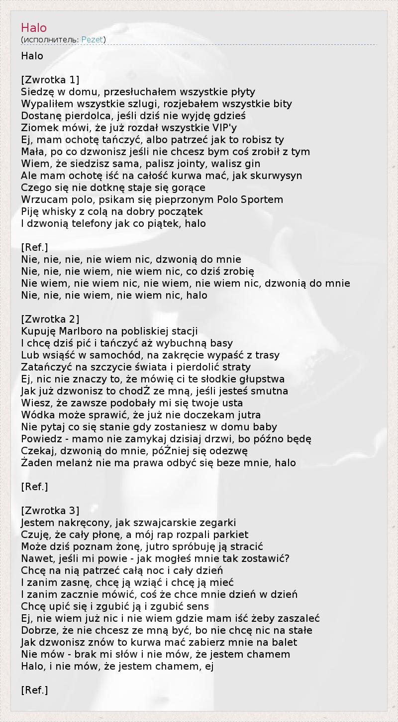 Halo [Zwrotka 1] Siedzę w domu, przesłuchałem wszystkie płyty Wypaliłem wszystkie szlugi, rozjebałem wszystkie bity Dostanę pierdolca, jeśli dziś nie wyjdę gdzieś Ziomek mówi, że już rozdał wszystkie VIP'y Ej, mam ochotę tańczyć, albo patrzeć jak to robisz ty Mała, po co dzwonisz jeśli nie chcesz bym coś zrobił z tym Wiem, że siedzisz sama, palisz jointy, walisz gin Ale mam ochotę iść na całość kurwa mać, jak skurwysyn Czego się nie dotknę staje się gorące Wrzucam polo, psikam się pieprzonym Polo Sportem Piję whisky z colą na dobry początek I dzwonią telefony jak co piątek, halo [Ref.] Nie, nie, nie, nie wiem nic, dzwonią do mnie Nie, nie, nie wiem, nie wiem nic, co dziś zrobię Nie wiem, nie wiem nic, nie wiem, nie wiem nic, dzwonią do mnie Nie, nie, nie wiem, nie wiem nic, halo [Zwrotka 2] Kupuję Marlboro na pobliskiej stacji I chcę dziś pić i tańczyć aż wybuchną basy Lub wsiąść w samochód, na zakręcie wypaść z trasy Zatańczyć na szczycie świata i pierdolić straty Ej, nic nie znaczy to, że mówię ci te słodkie głupstwa Jak już dzwonisz to chodŹ ze mną, jeśli jesteś smutna Wiesz, że zawsze podobały mi się twoje usta Wódka może sprawić, że już nie doczekam jutra Nie pytaj co się stanie gdy zostaniesz w domu baby Powiedz - mamo nie zamykaj dzisiaj drzwi, bo późno będę Czekaj, dzwonią do mnie, póŹniej się odezwę Żaden melanż nie ma prawa odbyć się beze mnie, halo [Ref.] [Zwrotka 3] Jestem nakręcony, jak szwajcarskie zegarki Czuję, że cały płonę, a mój rap rozpali parkiet Może dziś poznam żonę, jutro spróbuję ją stracić Nawet, jeśli mi powie - jak mogłeś mnie tak zostawić? Chcę na nią patrzeć całą noc i cały dzień I zanim zasnę, chcę ją wziąć i chcę ją mieć I zanim zacznie mówić, coś że chce mnie dzień w dzień Chcę upić się i zgubić ją i zgubić sens Ej, nie wiem już nic i nie wiem gdzie mam iść żeby zaszaleć Dobrze, że nie chcesz ze mną być, bo nie chcę nic na stałe Jak dzwonisz znów to kurwa mać zabierz mnie na balet Nie mów - brak mi słów i nie mów, że jestem chamem Halo, i nie mów, że jestem chamem, ej [Ref.]
