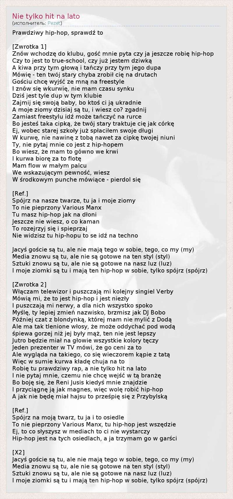 Prawdziwy hip-hop, sprawdź to [Zwrotka 1] Znów wchodzę do klubu, gość mnie pyta czy ja jeszcze robię hip-hop Czy to jest to true-school, czy już jestem dziwką A kiwa przy tym głową i tańczy przy tym jego dupa Mówię - ten twój stary chyba zrobił cię na drutach Gościu chcę wyjść ze mną na freestyle I znów się wkurwię, nie mam czasu synku Dziś jest tyle dup w tym klubie Zajmij się swoją baby, bo ktoś ci ją ukradnie A moje ziomy dzisiaj są tu, i wiesz co? zgadnij Zamiast freestylu idź może tańczyć na rurce Bo jesteś taka cipką, że twój stary traktuje cię jak córkę Ej, wobec starej szkoły już spłaciłem swoje długi W kurwę, nie nawinę z tobą nawet za cipkę twojej niuni Ty, nie pytaj mnie co jest z hip-hopem Bo wiesz, że mam to gówno we krwi I kurwa biorę za to flotę Mam flow w małym palcu We wskazującym pewność, wiesz W środkowym punche mówiące - pierdol się [Ref.] Spójrz na nasze twarze, tu ja i moje ziomy To nie pieprzony Various Manx Tu masz hip-hop jak na dłoni Jeszcze nie wiesz, o co kaman To rozejrzyj się i spieprzaj Nie widzisz tu hip-hopu to se idź na techno Jacyś goście są tu, ale nie mają tego w sobie, tego, co my (my) Media znowu są tu, ale nie są gotowe na ten styl (styl) Sztuki znowu są tu, ale nie są gotowe na nasz luz (luz) I moje ziomki są tu i mają ten hip-hop w sobie, tylko spójrz (spójrz) [Zwrotka 2] Włączam telewizor i puszczają mi kolejny singiel Verby Mówią mi, że to jest hip-hop i jest niezły I puszczają mi nerwy, a dla nich wszystko spoko Myślę, ty lepiej zmień nazwisko, brzmisz jak DJ Bobo Później czat z blondynką, której mam nie mylić z Dodą Ale ma tak tlenione włosy, że może oddychać pod wodą śpiewa gorzej niż jej były mąż, ten nie jest lepszy Jutro będzie miał na głowie wszystkie kolory tęczy Jeden prezenter w TV mówi, że go ceni za to Ale wygląda na takiego, co się wieczorem kąpie z tatą Więc w sumie kurwa kładę chuja na to Robię tu prawdziwy rap, a nie tylko hit na lato I nie pytaj mnie, czemu nie chcę wejść w tą branżę Bo boję się, że Reni Jusis kiedyś mnie znajdzie I przyciągnę ją jak magnes, więc wolę robić hip-hop A jak nie będę miał hajsu to prześpię się z Przybylską [Ref.] Spójrz na moją twarz, tu ja i to osiedle To nie pieprzony Various Manx, tu hip-hop jest wszędzie Ej, to co słyszysz w mediach to ci nie wystarczy Hip-hop jest na tych osiedlach, a ja trzymam go w garści [X2] Jacyś goście są tu, ale nie mają tego w sobie, tego, co my (my) Media znowu są tu, ale nie są gotowe na ten styl (styl) Sztuki znowu są tu, ale nie są gotowe na nasz luz (luz) I moje ziomki są tu i mają ten hip-hop w sobie, tylko spójrz (spójrz)