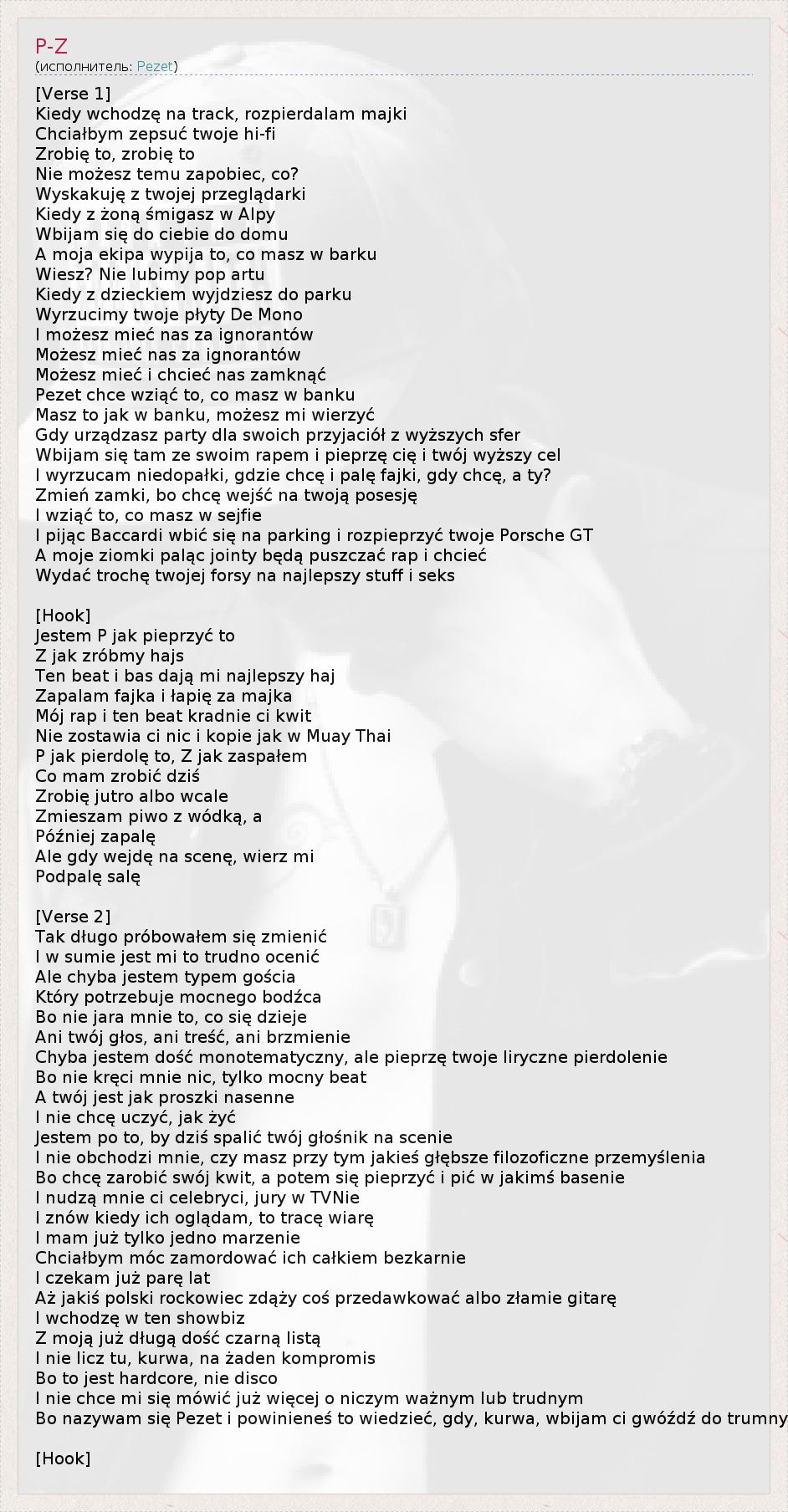 [Verse 1] Kiedy wchodzę na track, rozpierdalam majki Chciałbym zepsuć twoje hi-fi Zrobię to, zrobię to Nie możesz temu zapobiec, co? Wyskakuję z twojej przeglądarki Kiedy z żoną śmigasz w Alpy Wbijam się do ciebie do domu A moja ekipa wypija to, co masz w barku Wiesz? Nie lubimy pop artu Kiedy z dzieckiem wyjdziesz do parku Wyrzucimy twoje płyty De Mono I możesz mieć nas za ignorantów Możesz mieć nas za ignorantów Możesz mieć i chcieć nas zamknąć Pezet chce wziąć to, co masz w banku Masz to jak w banku, możesz mi wierzyć Gdy urządzasz party dla swoich przyjaciół z wyższych sfer Wbijam się tam ze swoim rapem i pieprzę cię i twój wyższy cel I wyrzucam niedopałki, gdzie chcę i palę fajki, gdy chcę, a ty? Zmień zamki, bo chcę wejść na twoją posesję I wziąć to, co masz w sejfie I pijąc Baccardi wbić się na parking i rozpieprzyć twoje Porsche GT A moje ziomki paląc jointy będą puszczać rap i chcieć Wydać trochę twojej forsy na najlepszy stuff i seks [Hook] Jestem P jak pieprzyć to Z jak zróbmy hajs Ten beat i bas dają mi najlepszy haj Zapalam fajka i łapię za majka Mój rap i ten beat kradnie ci kwit Nie zostawia ci nic i kopie jak w Muay Thai P jak pierdolę to, Z jak zaspałem Co mam zrobić dziś Zrobię jutro albo wcale Zmieszam piwo z wódką, a Później zapalę Ale gdy wejdę na scenę, wierz mi Podpalę salę [Verse 2] Tak długo próbowałem się zmienić I w sumie jest mi to trudno ocenić Ale chyba jestem typem gościa Który potrzebuje mocnego bodźca Bo nie jara mnie to, co się dzieje Ani twój głos, ani treść, ani brzmienie Chyba jestem dość monotematyczny, ale pieprzę twoje liryczne pierdolenie Bo nie kręci mnie nic, tylko mocny beat A twój jest jak proszki nasenne I nie chcę uczyć, jak żyć Jestem po to, by dziś spalić twój głośnik na scenie I nie obchodzi mnie, czy masz przy tym jakieś głębsze filozoficzne przemyślenia Bo chcę zarobić swój kwit, a potem się pieprzyć i pić w jakimś basenie I nudzą mnie ci celebryci, jury w TVNie I znów kiedy ich oglądam, to tracę wiarę I mam już tylko jedno marzenie Chciałbym móc zamordować ich całkiem bezkarnie I czekam już parę lat Aż jakiś polski rockowiec zdąży coś przedawkować albo złamie gitarę I wchodzę w ten showbiz Z moją już długą dość czarną listą I nie licz tu, kurwa, na żaden kompromis Bo to jest hardcore, nie disco I nie chce mi się mówić już więcej o niczym ważnym lub trudnym Bo nazywam się Pezet i powinieneś to wiedzieć, gdy, kurwa, wbijam ci gwóźdź do trumny [Hook]