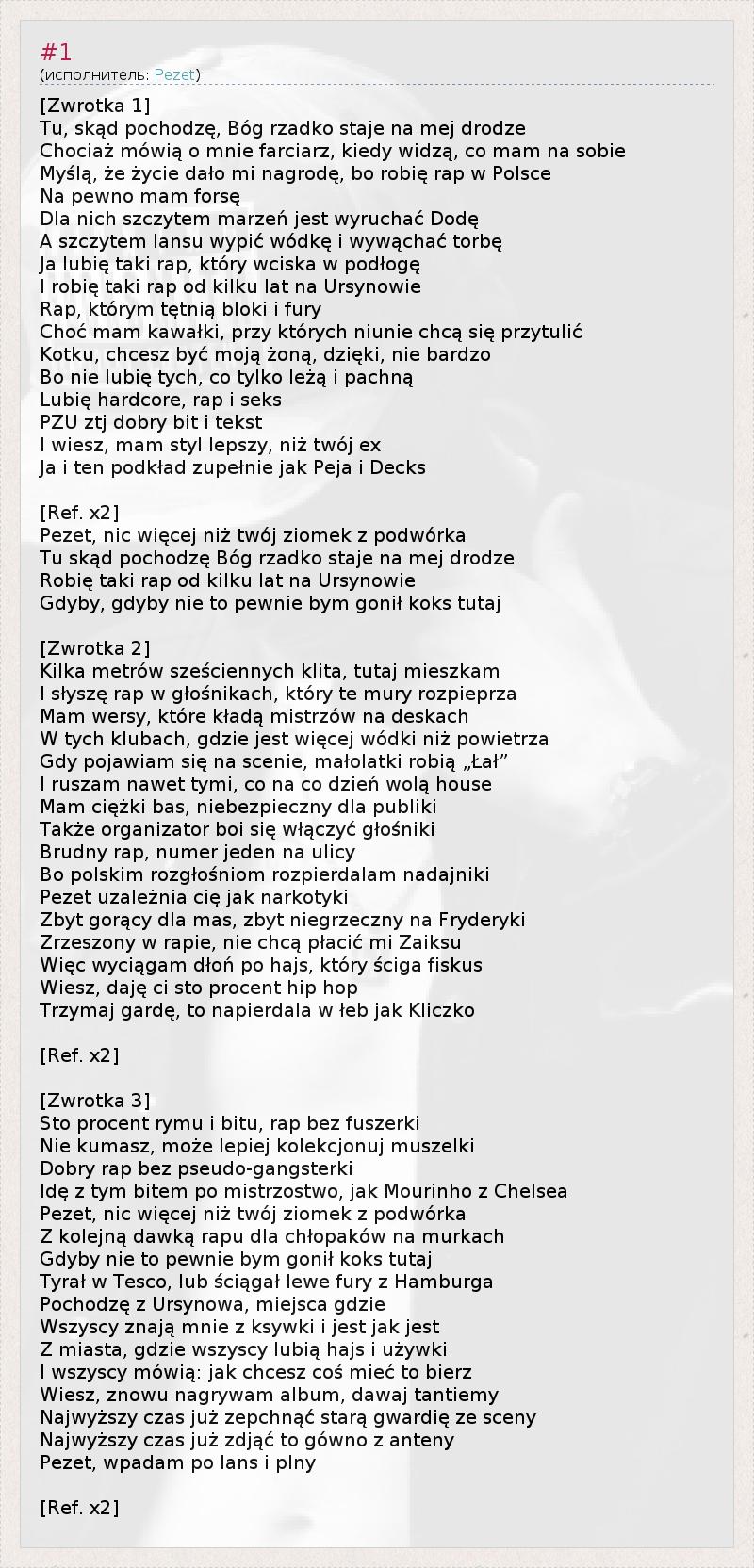 [Zwrotka 1] Tu, skąd pochodzę, Bóg rzadko staje na mej drodze Chociaż mówią o mnie farciarz, kiedy widzą, co mam na sobie Myślą, że życie dało mi nagrodę, bo robię rap w Polsce Na pewno mam forsę Dla nich szczytem marzeń jest wyruchać Dodę A szczytem lansu wypić wódkę i wywąchać torbę Ja lubię taki rap, który wciska w podłogę I robię taki rap od kilku lat na Ursynowie Rap, którym tętnią bloki i fury Choć mam kawałki, przy których niunie chcą się przytulić Kotku, chcesz być moją żoną, dzięki, nie bardzo Bo nie lubię tych, co tylko leżą i pachną Lubię hardcore, rap i seks PZU ztj dobry bit i tekst I wiesz, mam styl lepszy, niż twój ex Ja i ten podkład zupełnie jak Peja i Decks [Ref. x2] Pezet, nic więcej niż twój ziomek z podwórka Tu skąd pochodzę Bóg rzadko staje na mej drodze Robię taki rap od kilku lat na Ursynowie Gdyby, gdyby nie to pewnie bym gonił koks tutaj [Zwrotka 2] Kilka metrów sześciennych klita, tutaj mieszkam I słyszę rap w głośnikach, który te mury rozpieprza Mam wersy, które kładą mistrzów na deskach W tych klubach, gdzie jest więcej wódki niż powietrza Gdy pojawiam się na scenie, małolatki robią „Łał” I ruszam nawet tymi, co na co dzień wolą house Mam ciężki bas, niebezpieczny dla publiki Także organizator boi się włączyć głośniki Brudny rap, numer jeden na ulicy Bo polskim rozgłośniom rozpierdalam nadajniki Pezet uzależnia cię jak narkotyki Zbyt gorący dla mas, zbyt niegrzeczny na Fryderyki Zrzeszony w rapie, nie chcą płacić mi Zaiksu Więc wyciągam dłoń po hajs, który ściga fiskus Wiesz, daję ci sto procent hip hop Trzymaj gardę, to napierdala w łeb jak Kliczko [Ref. x2] [Zwrotka 3] Sto procent rymu i bitu, rap bez fuszerki Nie kumasz, może lepiej kolekcjonuj muszelki Dobry rap bez pseudo-gangsterki Idę z tym bitem po mistrzostwo, jak Mourinho z Chelsea Pezet, nic więcej niż twój ziomek z podwórka Z kolejną dawką rapu dla chłopaków na murkach Gdyby nie to pewnie bym gonił koks tutaj Tyrał w Tesco, lub ściągał lewe fury z Hamburga Pochodzę z Ursynowa, miejsca gdzie Wszyscy znają mnie z ksywki i jest jak jest Z miasta, gdzie wszyscy lubią hajs i używki I wszyscy mówią: jak chcesz coś mieć to bierz Wiesz, znowu nagrywam album, dawaj tantiemy Najwyższy czas już zepchnąć starą gwardię ze sceny Najwyższy czas już zdjąć to gówno z anteny Pezet, wpadam po lans i plny [Ref. x2]