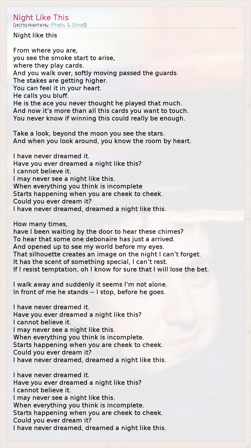 Ночь как эта С того места где ты сейчас стоишь, Ты видишь как дым начинает подниматься, Где они играют в карты. И ты идёшь плавно, минуя охранников. Ставки становятся всё выше. Ты можешь чувствовать это в своём сердце. Он говорит что ты обманщица. Он ас, ты никогда не думала, что он многое повидал. И теперь это больше, чем игра, в которую ты хочешь сыграть. Ты никогда не знаешь, хватит ли тебе этой одной победы. Посмотри, за луной ты видишь звёзды. И когда ты оглядываешься, ты знаешь комнату наизусть. Я никогда не мечтала об этом. Ты когда-либо мечтал о ночи, подобной этой? Я не могу в это поверить. Возможно, я так никогда и не получу ночь, подобную этой. Когда всё, о чём ты мечтала до этого, Начинает сбываться, когда вы рядом. Мог ли ты когда-либо мечтать об этом? Я никогда не мечтала, не мечтала о ночи, подобной этой. Сколько времени я прождала у двери, чтобы услышать этот звонок? Услышать, что некто любезный только что приехал. И открывая дверь, увидеть всю жизнь перед глазами. Тот силуэт создает образ в ночи, который я не могу забыть. У него особый аромат, я не могу расслабиться. Если я сопротивляюсь искушению, о, я знаю наверняка, что проиграю пари. Я ухожу и вдруг оказывается, что я не одинока. Он стоит передо мной — я останавливаюсь, прежде чем он подойдёт. Я никогда не мечтала об этом. Ты когда-либо мечтал о ночи подобно этой? Я не могу в это поверить. Возможно я так никогда и не получу ночь, подобную этой. Когда всё, о чём ты мечтала до этого, Начинает сбываться, когда вы рядом. Мог ли ты когда-либо мечтать об этом? Я никогда не мечтала, не мечтала о ночи, подобной этой. Я никогда не мечтала об этом. Ты когда-либо мечтал о ночи, подобной этой? Я не могу в это поверить. Возможно я так никогда и не получу ночь, подобную этой. Когда всё о чём ты мечтала до этого, Начинает сбываться, когда вы рядом. Мог ли ты когда-либо мечтать об этом? Я никогда не мечтала, не мечтала о ночи, подобной этой.