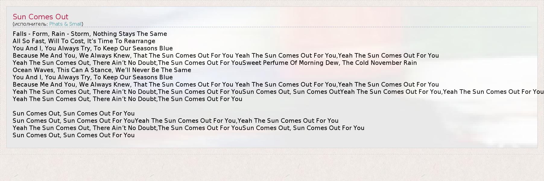 Falls - Form, Rain - Storm, Nothing Stays The Same All So Fast, Will To Cost, It’s Time To Rearrange You And I, You Always Try, To Keep Our Seasons Blue Because Me And You, We Always Knew, That The Sun Comes Out For You Yeah The Sun Comes Out For You,Yeah The Sun Comes Out For You Yeah The Sun Comes Out, There Ain’t No Doubt,The Sun Comes Out For YouSweet Perfume Of Morning Dew, The Cold November Rain Ocean Waves, This Can A Stance, We’ll Never Be The Same You And I, You Always Try, To Keep Our Seasons Blue Because Me And You, We Always Knew, That The Sun Comes Out For You Yeah The Sun Comes Out For You,Yeah The Sun Comes Out For You Yeah The Sun Comes Out, There Ain’t No Doubt,The Sun Comes Out For YouSun Comes Out, Sun Comes OutYeah The Sun Comes Out For You,Yeah The Sun Comes Out For You Yeah The Sun Comes Out, There Ain’t No Doubt,The Sun Comes Out For You Sun Comes Out, Sun Comes Out For You Sun Comes Out, Sun Comes Out For YouYeah The Sun Comes Out For You,Yeah The Sun Comes Out For You Yeah The Sun Comes Out, There Ain’t No Doubt,The Sun Comes Out For YouSun Comes Out, Sun Comes Out For You Sun Comes Out, Sun Comes Out For You