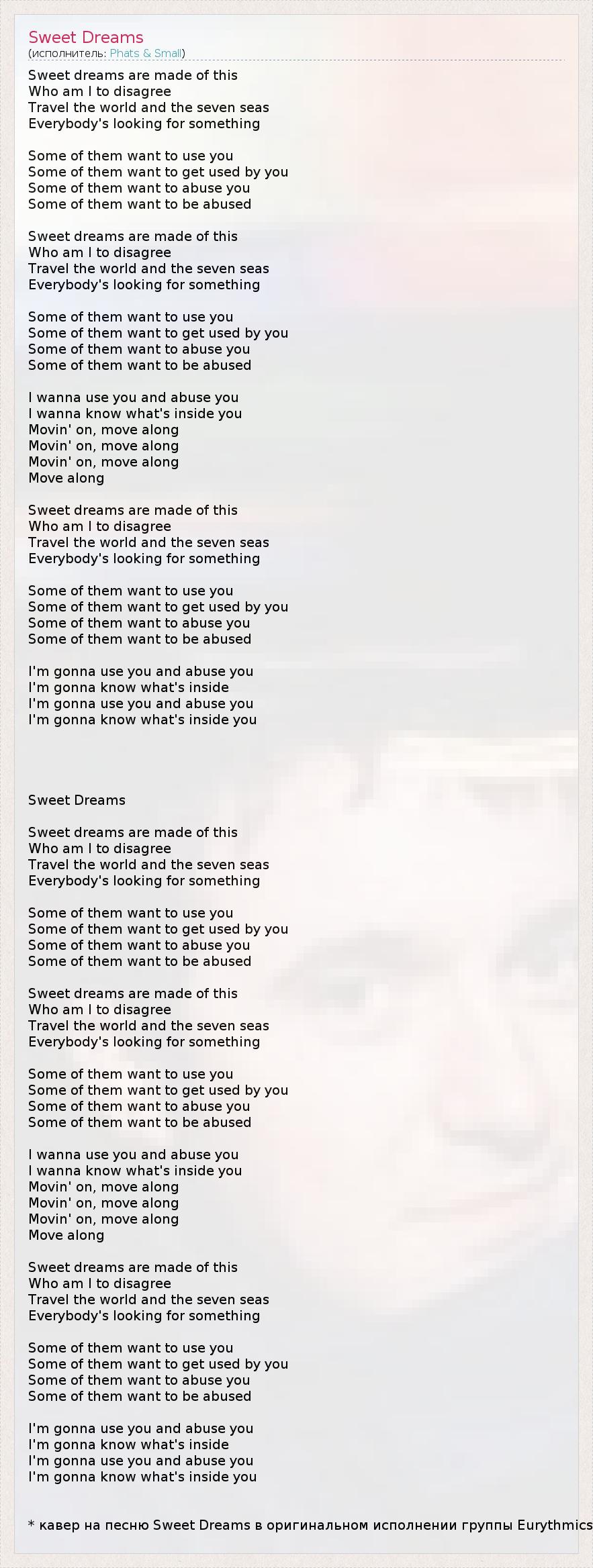Sweet dreams are made of this Who am I to disagree Travel the world and the seven seas Everybody's looking for something Some of them want to use you Some of them want to get used by you Some of them want to abuse you Some of them want to be abused Sweet dreams are made of this Who am I to disagree Travel the world and the seven seas Everybody's looking for something Some of them want to use you Some of them want to get used by you Some of them want to abuse you Some of them want to be abused I wanna use you and abuse you I wanna know what's inside you Movin' on, move along Movin' on, move along Movin' on, move along Move along Sweet dreams are made of this Who am I to disagree Travel the world and the seven seas Everybody's looking for something Some of them want to use you Some of them want to get used by you Some of them want to abuse you Some of them want to be abused I'm gonna use you and abuse you I'm gonna know what's inside I'm gonna use you and abuse you I'm gonna know what's inside you Sweet Dreams Sweet dreams are made of this Who am I to disagree Travel the world and the seven seas Everybody's looking for something Some of them want to use you Some of them want to get used by you Some of them want to abuse you Some of them want to be abused Sweet dreams are made of this Who am I to disagree Travel the world and the seven seas Everybody's looking for something Some of them want to use you Some of them want to get used by you Some of them want to abuse you Some of them want to be abused I wanna use you and abuse you I wanna know what's inside you Movin' on, move along Movin' on, move along Movin' on, move along Move along Sweet dreams are made of this Who am I to disagree Travel the world and the seven seas Everybody's looking for something Some of them want to use you Some of them want to get used by you Some of them want to abuse you Some of them want to be abused I'm gonna use you and abuse you I'm gonna know what's inside I'm gonna use you and abuse you I'm gonna know what's inside you * кавер на песню Sweet Dreams в оригинальном исполнении группы Eurythmics