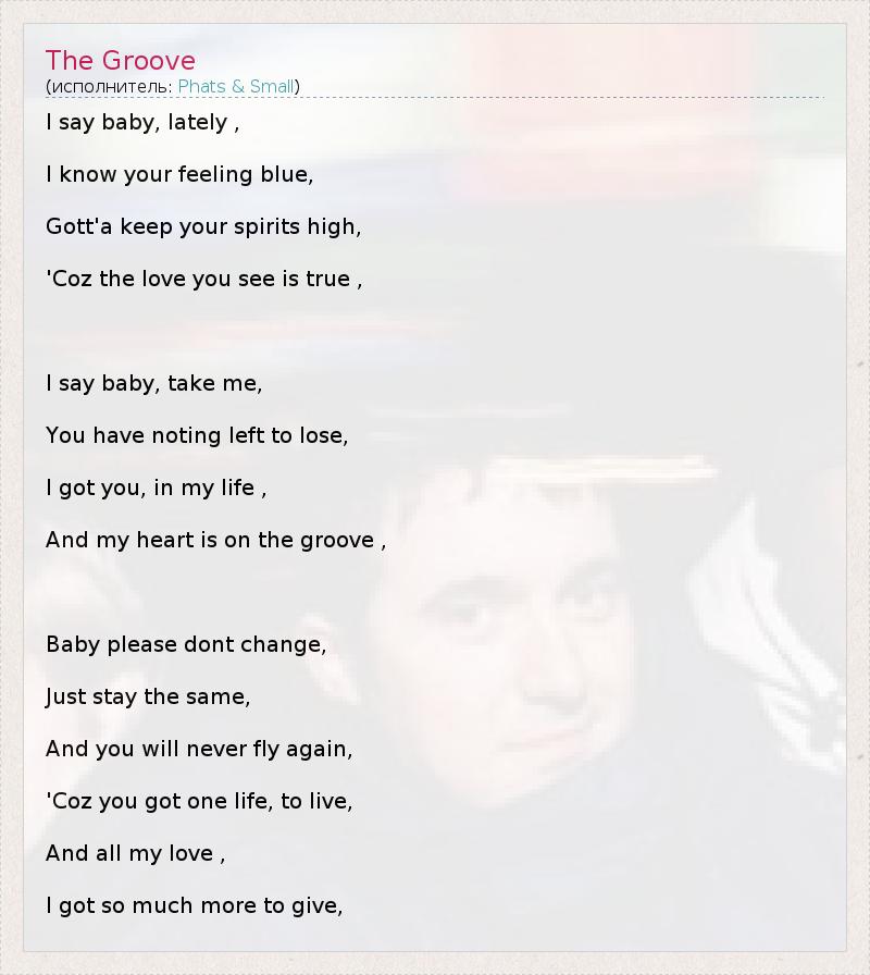 I say baby, lately , I know your feeling blue, Gott'a keep your spirits high, 'Coz the love you see is true , I say baby, take me, You have noting left to lose, I got you, in my life , And my heart is on the groove , Baby please dont change, Just stay the same, And you will never fly again, 'Coz you got one life, to live, And all my love , I got so much more to give,