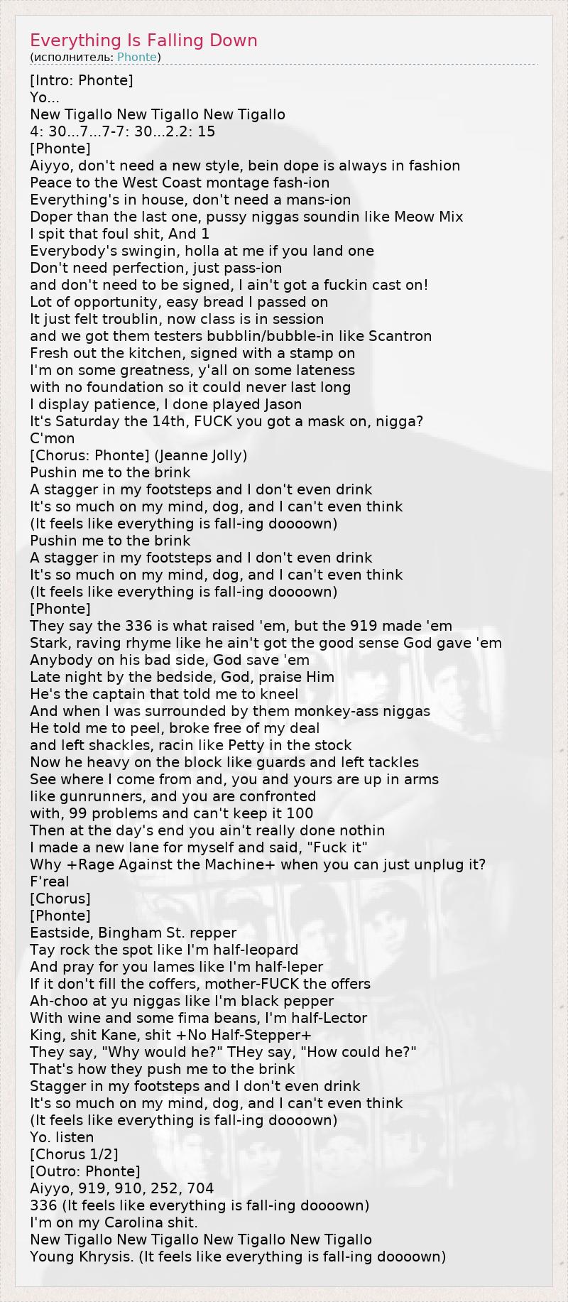[Intro: Phonte] Yo... New Tigallo New Tigallo New Tigallo 4: 30...7...7-7: 30...2.2: 15 [Phonte] Aiyyo, don't need a new style, bein dope is always in fashion Peace to the West Coast montage fash-ion Everything's in house, don't need a mans-ion Doper than the last one, pussy niggas soundin like Meow Mix I spit that foul shit, And 1 Everybody's swingin, holla at me if you land one Don't need perfection, just pass-ion and don't need to be signed, I ain't got a fuckin cast on! Lot of opportunity, easy bread I passed on It just felt troublin, now class is in session and we got them testers bubblin/bubble-in like Scantron Fresh out the kitchen, signed with a stamp on I'm on some greatness, y'all on some lateness with no foundation so it could never last long I display patience, I done played Jason It's Saturday the 14th, FUCK you got a mask on, nigga? C'mon [Chorus: Phonte] (Jeanne Jolly) Pushin me to the brink A stagger in my footsteps and I don't even drink It's so much on my mind, dog, and I can't even think (It feels like everything is fall-ing doooown) Pushin me to the brink A stagger in my footsteps and I don't even drink It's so much on my mind, dog, and I can't even think (It feels like everything is fall-ing doooown) [Phonte] They say the 336 is what raised 'em, but the 919 made 'em Stark, raving rhyme like he ain't got the good sense God gave 'em Anybody on his bad side, God save 'em Late night by the bedside, God, praise Him He's the captain that told me to kneel And when I was surrounded by them monkey-ass niggas He told me to peel, broke free of my deal and left shackles, racin like Petty in the stock Now he heavy on the block like guards and left tackles See where I come from and, you and yours are up in arms like gunrunners, and you are confronted with, 99 problems and can't keep it 100 Then at the day's end you ain't really done nothin I made a new lane for myself and said, "Fuck it" Why +Rage Against the Machine+ when you can just unplug it? F'real [Chorus] [Phonte] Eastside, Bingham St. repper Tay rock the spot like I'm half-leopard And pray for you lames like I'm half-leper If it don't fill the coffers, mother-FUCK the offers Ah-choo at yu niggas like I'm black pepper With wine and some fima beans, I'm half-Lector King, shit Kane, shit +No Half-Stepper+ They say, "Why would he?" THey say, "How could he?" That's how they push me to the brink Stagger in my footsteps and I don't even drink It's so much on my mind, dog, and I can't even think (It feels like everything is fall-ing doooown) Yo. listen [Chorus 1/2] [Outro: Phonte] Aiyyo, 919, 910, 252, 704 336 (It feels like everything is fall-ing doooown) I'm on my Carolina shit. New Tigallo New Tigallo New Tigallo New Tigallo Young Khrysis. (It feels like everything is fall-ing doooown)