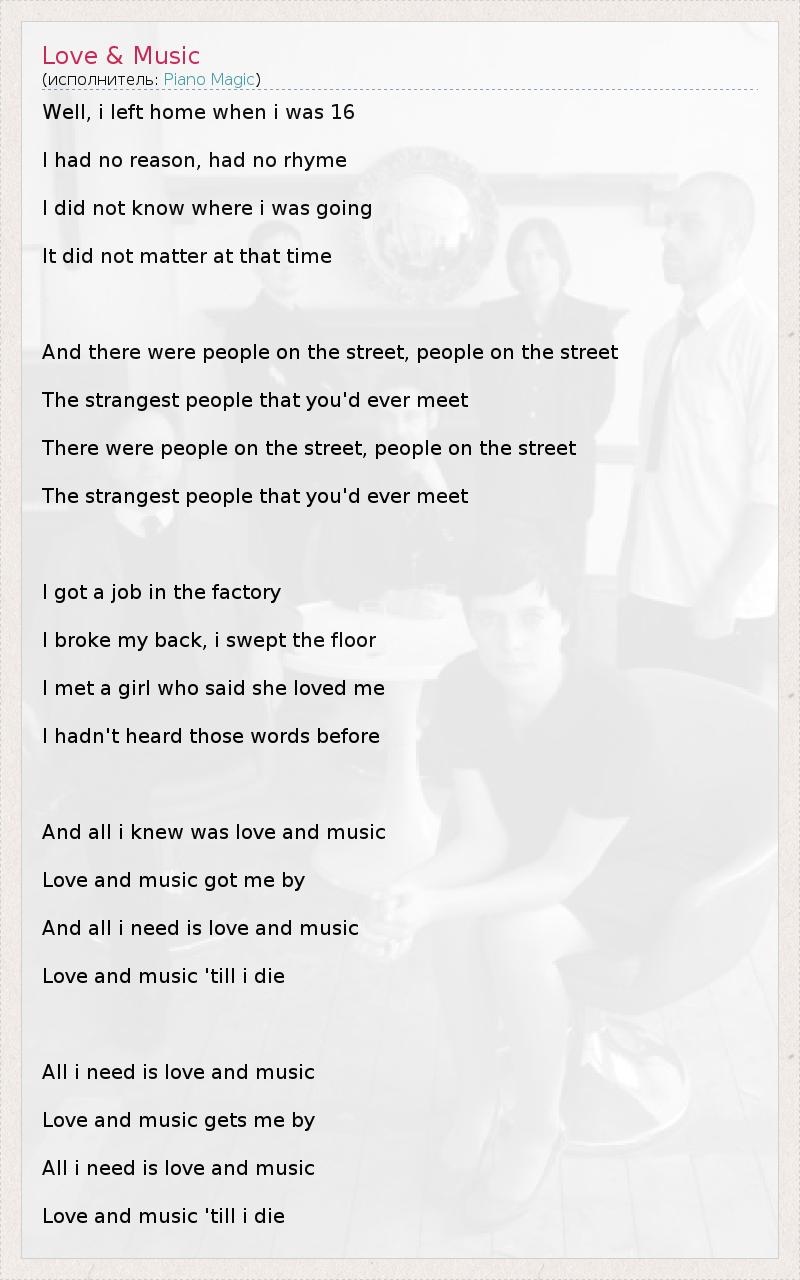 Well, i left home when i was 16 I had no reason, had no rhyme I did not know where i was going It did not matter at that time And there were people on the street, people on the street The strangest people that you'd ever meet There were people on the street, people on the street The strangest people that you'd ever meet I got a job in the factory I broke my back, i swept the floor I met a girl who said she loved me I hadn't heard those words before And all i knew was love and music Love and music got me by And all i need is love and music Love and music 'till i die All i need is love and music Love and music gets me by All i need is love and music Love and music 'till i die