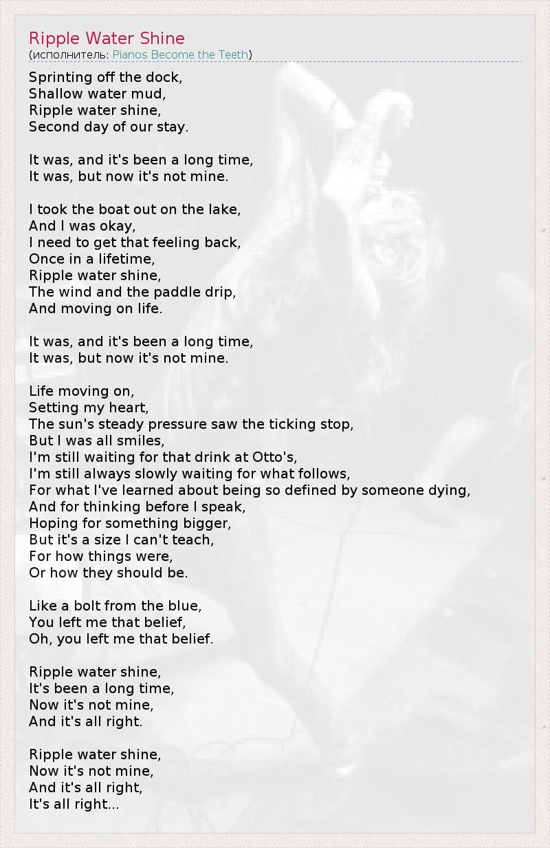 Sprinting off the dock, Shallow water mud, Ripple water shine, Second day of our stay. It was, and it's been a long time, It was, but now it's not mine. I took the boat out on the lake, And I was okay, I need to get that feeling back, Once in a lifetime, Ripple water shine, The wind and the paddle drip, And moving on life. It was, and it's been a long time, It was, but now it's not mine. Life moving on, Setting my heart, The sun's steady pressure saw the ticking stop, But I was all smiles, I'm still waiting for that drink at Otto's, I'm still always slowly waiting for what follows, For what I've learned about being so defined by someone dying, And for thinking before I speak, Hoping for something bigger, But it's a size I can't teach, For how things were, Or how they should be. Like a bolt from the blue, You left me that belief, Oh, you left me that belief. Ripple water shine, It's been a long time, Now it's not mine, And it's all right. Ripple water shine, Now it's not mine, And it's all right, It's all right...