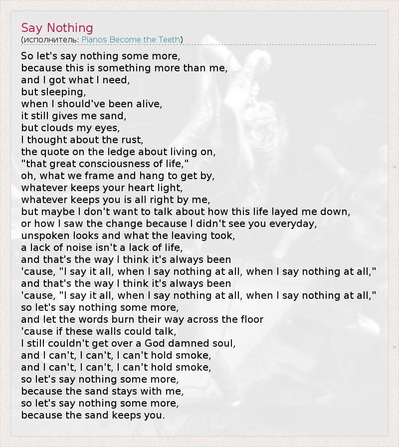 Так что давайте говорить нечего еще немного, потому что это нечто большее, чем мне, и я получил то, что мне нужно, но сон, когда я должен был быть в живых, он по-прежнему дает мне песок, но облака мои глаза, Я думал о ржавчины, цитата на выступе о жизни на, & Quot; великий сознание жизни, и Quot; ой, что мы кадр и повесить, чтобы получить от, что держит ваше сердце свет, что держит вас все в порядке со мной, но, может быть, я не хочу говорить о том, как эта жизнь заложил меня, или как я увидел изменения, потому что я не вижу, что вы каждый день, негласные внешний вид и то, что уход взял, отсутствие шума не отсутствие жизни, и это, как я думаю, что это всегда было Потому, & Quot; я говорю все это, когда я ничего не говорю вообще, когда я ничего не говорю вообще, и Quot; и это, как я думаю, что это всегда было Потому, & Quot; я говорю все это, когда я ничего не говорю вообще, когда я ничего не говорю вообще, и Quot; так что давайте не говорить ничего еще, и пусть слова сжечь свой путь по полу Потому что если бы эти стены могли говорить, Я до сих пор не может получить более Бога проклятый душу, а я не могу, я не могу, я не могу держать дым, а я не могу, я не могу, я не могу держать дым, так что давайте не говорить ничего еще, потому что песок остается со мной, так что давайте не говорить ничего еще, потому что песок хранит вас.