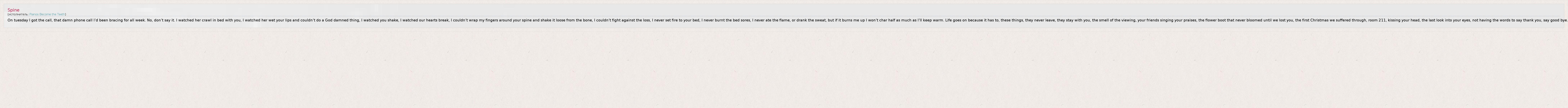 Во вторник мне позвонили , эту чертову телефонный звонок я был общеукрепляющее на всю неделю . Нет, не говорите это . Я смотрел, как она ползать в постели с вами, я смотрел, как она намочить ваши губы и не мог сделать богом проклятую вещь, я видел, как ты трясти, я смотрел наши сердца сломать , я не мог обернуть пальцы вокруг вашего позвоночника и встряхните его потерять от кости , я не мог бороться против потери , я никогда не подожгли вашей кровати , я никогда не сжег язвы кровать, я никогда не ел пламя , или пили пот , но если он горит меня я не обугливается вдвое меньше, чем я буду держать тепло. Жизнь продолжается , поскольку он имеет , чтобы эти вещи , они не покидают , они остаются с вами , запах просмотра, ваши друзья поют ваши похвалы , цветок загрузки, который никогда не цвели , пока мы не потерял тебя , первое Рождество мы пережили , номер 211 , целуя свою голову , последний взгляд в глаза, не имея слов, чтобы сказать спасибо , сказать до свидания .