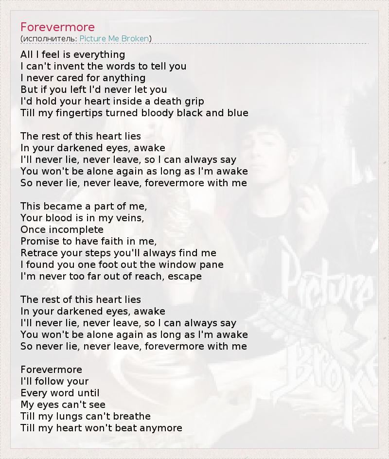 All I feel is everything I can't invent the words to tell you I never cared for anything But if you left I'd never let you I'd hold your heart inside a death grip Till my fingertips turned bloody black and blue The rest of this heart lies In your darkened eyes, awake I'll never lie, never leave, so I can always say You won't be alone again as long as I'm awake So never lie, never leave, forevermore with me This became a part of me, Your blood is in my veins, Once incomplete Promise to have faith in me, Retrace your steps you'll always find me I found you one foot out the window pane I'm never too far out of reach, escape The rest of this heart lies In your darkened eyes, awake I'll never lie, never leave, so I can always say You won't be alone again as long as I'm awake So never lie, never leave, forevermore with me Forevermore I'll follow your Every word until My eyes can't see Till my lungs can't breathe Till my heart won't beat anymore