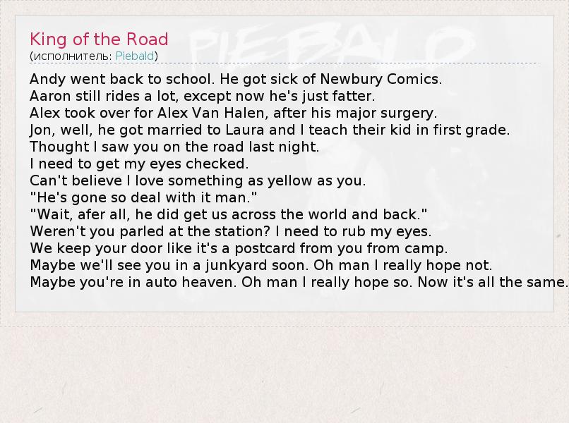 Это интересно:Piebald is an American alternative rock band. Piebald started as a hardcore band in Andover, Massachusetts, out of the same scene that produced Converge. They later moved to the Boston suburb of Somerville and became a staple of the Greater Boston indie rock scene. Two members still live in the Boston area, while two others now live in Los Angeles. Piebald's last show was on April 19, 2008, at Middle East Downstairs in Cambridge, Massachusetts, though the band reunited for a set at The Bamboozle in East Rutherford, New Jersey, on May 2, 2010.