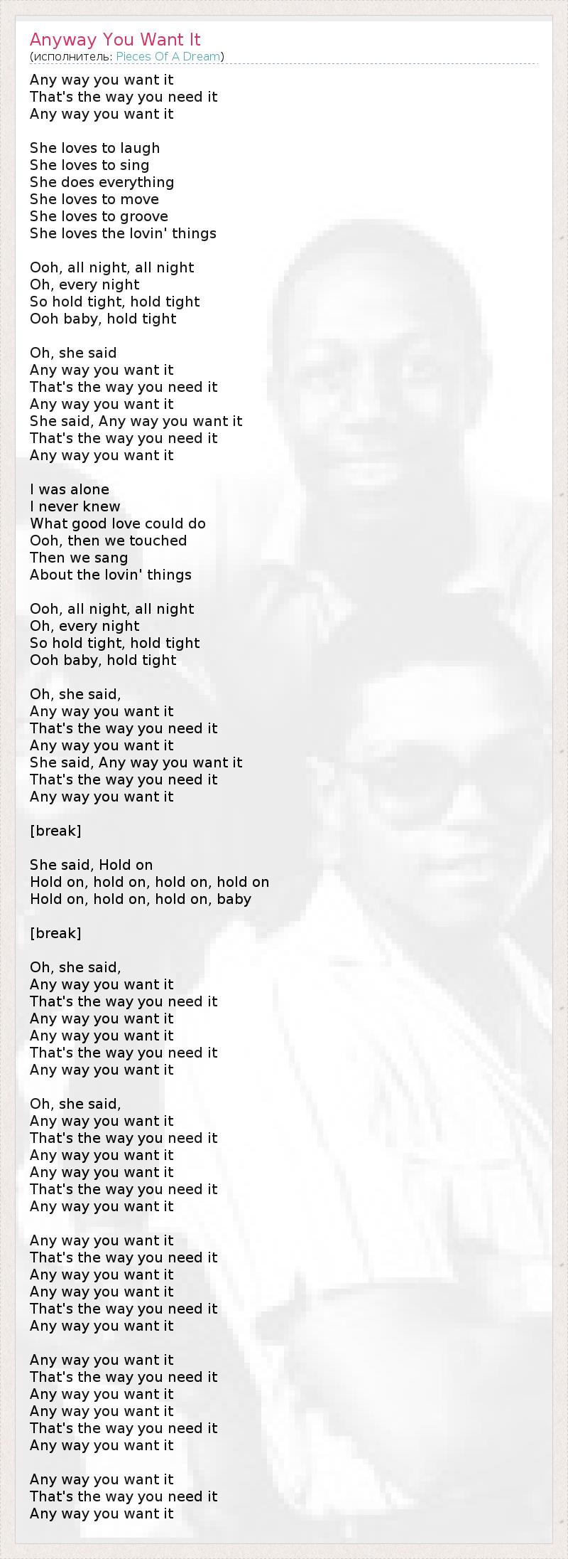 Any way you want it That's the way you need it Any way you want it She loves to laugh She loves to sing She does everything She loves to move She loves to groove She loves the lovin' things Ooh, all night, all night Oh, every night So hold tight, hold tight Ooh baby, hold tight Oh, she said Any way you want it That's the way you need it Any way you want it She said, Any way you want it That's the way you need it Any way you want it I was alone I never knew What good love could do Ooh, then we touched Then we sang About the lovin' things Ooh, all night, all night Oh, every night So hold tight, hold tight Ooh baby, hold tight Oh, she said, Any way you want it That's the way you need it Any way you want it She said, Any way you want it That's the way you need it Any way you want it [break] She said, Hold on Hold on, hold on, hold on, hold on Hold on, hold on, hold on, baby [break] Oh, she said, Any way you want it That's the way you need it Any way you want it Any way you want it That's the way you need it Any way you want it Oh, she said, Any way you want it That's the way you need it Any way you want it Any way you want it That's the way you need it Any way you want it Any way you want it That's the way you need it Any way you want it Any way you want it That's the way you need it Any way you want it Any way you want it That's the way you need it Any way you want it Any way you want it That's the way you need it Any way you want it Any way you want it That's the way you need it Any way you want it