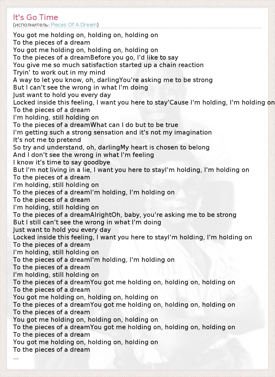 You got me holding on, holding on, holding on To the pieces of a dream You got me holding on, holding on, holding on To the pieces of a dreamBefore you go, I'd like to say You give me so much satisfaction started up a chain reaction Tryin' to work out in my mind A way to let you know, oh, darlingYou're asking me to be strong But I can't see the wrong in what I'm doing Just want to hold you every day Locked inside this feeling, I want you here to stay'Cause I'm holding, I'm holding on To the pieces of a dream I'm holding, still holding on To the pieces of a dreamWhat can I do but to be true I'm getting such a strong sensation and it's not my imagination It's not me to pretend So try and understand, oh, darlingMy heart is chosen to belong And I don't see the wrong in what I'm feeling I know it's time to say goodbye But I'm not living in a lie, I want you here to stayI'm holding, I'm holding on To the pieces of a dream I'm holding, still holding on To the pieces of a dreamI'm holding, I'm holding on To the pieces of a dream I'm holding, still holding on To the pieces of a dreamAlrightOh, baby, you're asking me to be strong But I still can't see the wrong in what I'm doing Just want to hold you every day Locked inside this feeling, I want you here to stayI'm holding, I'm holding on To the pieces of a dream I'm holding, still holding on To the pieces of a dreamI'm holding, I'm holding on To the pieces of a dream I'm holding, still holding on To the pieces of a dreamYou got me holding on, holding on, holding on To the pieces of a dream You got me holding on, holding on, holding on To the pieces of a dreamYou got me holding on, holding on, holding on To the pieces of a dream You got me holding on, holding on, holding on To the pieces of a dreamYou got me holding on, holding on, holding on To the pieces of a dream You got me holding on, holding on, holding on To the pieces of a dream ...
