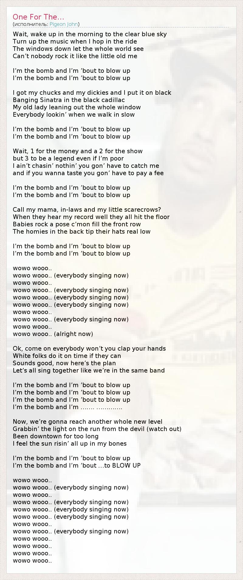 Wait, wake up in the morning to the clear blue sky Turn up the music when I hop in the ride The windows down let the whole world see Can’t nobody rock it like the little old me I’m the bomb and I’m ’bout to blow up I’m the bomb and I’m ’bout to blow up I got my chucks and my dickies and I put it on black Banging Sinatra in the black cadillac My old lady leaning out the whole window Everybody lookin’ when we walk in slow I’m the bomb and I’m ’bout to blow up I’m the bomb and I’m ’bout to blow up Wait, 1 for the money and a 2 for the show but 3 to be a legend even if I’m poor I ain’t chasin’ nothin’ you gon’ have to catch me and if you wanna taste you gon’ have to pay a fee I’m the bomb and I’m ’bout to blow up I’m the bomb and I’m ’bout to blow up Call my mama, in-laws and my little scarecrows? When they hear my record well they all hit the floor Babies rock a pose c’mon fill the front row The homies in the back tip their hats real low I’m the bomb and I’m ’bout to blow up I’m the bomb and I’m ’bout to blow up wowo wooo.. wowo wooo.. (everybody singing now) wowo wooo.. wowo wooo.. (everybody singing now) wowo wooo.. (everybody singing now) wowo wooo.. (everybody singing now) wowo wooo.. wowo wooo.. (everybody singing now) wowo wooo.. wowo wooo.. (alright now) Ok, come on everybody won’t you clap your hands White folks do it on time if they can Sounds good, now here’s the plan Let’s all sing together like we’re in the same band I’m the bomb and I’m ’bout to blow up I’m the bomb and I’m ’bout to blow up I’m the bomb and I’m ’bout to blow up I’m the bomb and I’m ……. …………. Now, we’re gonna reach another whole new level Grabbin’ the light on the run from the devil (watch out) Been downtown for too long I feel the sun risin’ all up in my bones I’m the bomb and I’m ’bout to blow up I’m the bomb and I’m ’bout …to BLOW UP wowo wooo.. wowo wooo.. (everybody singing now) wowo wooo.. wowo wooo.. (everybody singing now) wowo wooo.. (everybody singing now) wowo wooo.. (everybody singing now) wowo wooo.. wowo wooo.. (everybody singing now) wowo wooo.. wowo wooo.. wowo wooo.. wowo wooo..