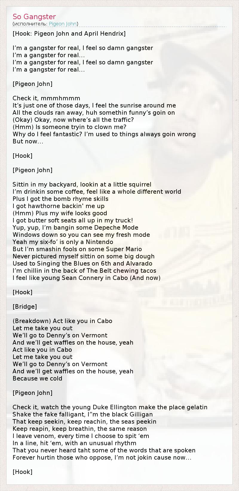 [Hook: Pigeon John and April Hendrix] I’m a gangster for real, I feel so damn gangster I’m a gangster for real… I’m a gangster for real, I feel so damn gangster I’m a gangster for real… [Pigeon John] Check it, mmmhmmm It’s just one of those days, I feel the sunrise around me All the clouds ran away, huh somethin funny’s goin on (Okay) Okay, now where’s all the traffic? (Hmm) Is someone tryin to clown me? Why do I feel fantastic? I’m used to things always goin wrong But now… [Hook] [Pigeon John] Sittin in my backyard, lookin at a little squirrel I’m drinkin some coffee, feel like a whole different world Plus I got the bomb rhyme skills I got hawthorne backin' me up (Hmm) Plus my wife looks good I got butter soft seats all up in my truck! Yup, yup, I’m bangin some Depeche Mode Windows down so you can see my fresh mode Yeah my six-fo’ is only a Nintendo But I’m smashin fools on some Super Mario Never pictured myself sittin on some big dough Used to Singing the Blues on 6th and Alvarado I’m chillin in the back of The Belt chewing tacos I feel like young Sean Connery in Cabo (And now) [Hook] [Bridge] (Breakdown) Act like you in Cabo Let me take you out We’ll go to Denny’s on Vermont And we’ll get waffles on the house, yeah Act like you in Cabo Let me take you out We’ll go to Denny’s on Vermont And we’ll get waffles on the house, yeah Because we cold [Pigeon John] Check it, watch the young Duke Ellington make the place gelatin Shake the fake falligant, I”m the black Gilligan That keep seekin, keep reachin, the seas peekin Keep reapin, keep breathin, the same reason I leave venom, every time I choose to spit ‘em In a line, hit ‘em, with an unusual rhythm That you never heard taht some of the words that are spoken Forever hurtin those who oppose, I’m not jokin cause now… [Hook]