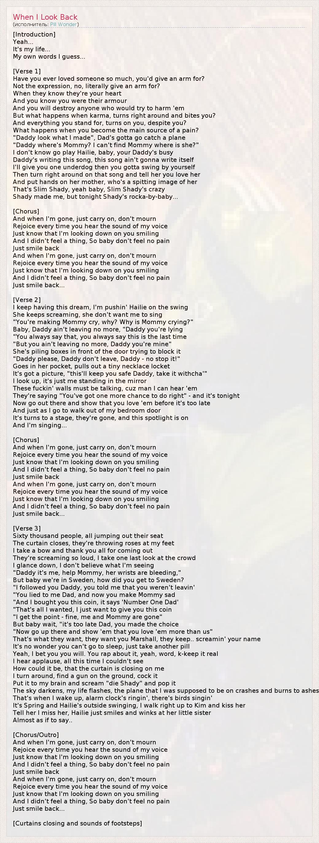 [Вступление] Да… Это моя жизнь… Думаю, это мои слова… [1-ый куплет] Ты когда-нибудь любил так сильно, что мог бы жизнь отдать за того, другого, Но не в переносном смысле, а буквально? При этом объект твоего чувства знал бы, что является всем для тебя, А ты, в свою очередь, знаешь, что ты – защитная стена для этого человека И что ты не пощадишь его обидчиков. А что, если тебя начинает преследовать злой рок, А всё, что ты отстаивал, оборачивается против тебя, вопреки тебе? А что, если ты становишься источником страданий? «Папочка, посмотри, что я сделала!», а папа спешит на самолёт. «Папочка, где мамуля? Я нигде не могу её найти!» Я не знаю, иди, поиграй, Хейли, девочка, папочка занят, Папочка пишет эту песню, ведь она сама не напишется! Ну, ладно, я немного отвлекусь на тебя, но потом не приставай ко мне! Так ты бросаешь песню и говоришь дочери, что любишь её, И, обнимая её, словно обнимаешь её мать, ведь твоя дочь – вылитый портрет матери… Это Слим Шейди, да, малышка, Слим Шейди сошёл с ума. Обычно я – Шейди, но сегодня я буду убаюкивать свою девочку… [Припев:] А когда я умру, не оплакивай меня, живи дальше. Радуйся каждый раз, когда услышишь звук моего голоса. Знай, что я смотрю на тебя с небес и улыбаюсь, И что мне совсем не больно, поэтому, малышка, не печалься, Просто улыбайся мне в ответ. А когда я умру, не оплакивай меня, живи дальше. Радуйся каждый раз, когда услышишь звук моего голоса. Знай, что я смотрю на тебя с небес и улыбаюсь, И что мне совсем не больно, поэтому, малышка, не печалься, Просто улыбайся мне в ответ… [2-ой куплет] Меня всё мучает этот сон, в котором я качаю Хейли на качелях, А она всё кричит и не хочет, чтобы я пел. «Из-за тебя мамочка всегда плачет, почему? Почему мамочка плачет?» Девочка, папочка больше не оставит тебя. «Папочка, ты всё врёшь, Ты всегда так говоришь, всегда повторяешь, что это в последний раз. Не уезжай, папочка, ты мой». Она в кучу сваливает коробки перед входной дверью, чтобы заблокировать выход. «Папочка, пожалуйста, папочка, не уезжай, папочка, нет, прекрати это!» Затем она достаёт из кармана крохотный медальончик С фотографией: «Он убережёт тебя от несчастий, папочка, пусть он всегда будет с тобой». Я поднимаю глаза и замечаю в зеркале своё отражение. Эти чёртовы стены, по-моему, живые: я слышу, как они говорят! Они говорят: «У тебя есть последний шанс, чтобы исправиться, и сегодня – последний день для этого. А теперь иди и докажи им свою любовь, пока не поздно». И в тот миг, когда я выхожу из спальни, Я оказываюсь на сцене, все исчезли кроме меня, я – в свете прожекторов И я пою… [Припев:] А когда я умру, не оплакивай меня, живи дальше. Радуйся каждый раз, когда услышишь звук моего голоса. Знай, что я смотрю на тебя с небес и улыбаюсь, И что мне совсем не больно, поэтому, малышка, не печалься, Просто улыбайся мне в ответ. А когда я умру, не оплакивай меня, живи дальше. Радуйся каждый раз, когда услышишь звук моего голоса. Знай, что я смотрю на тебя с небес и улыбаюсь, И что мне совсем не больно, поэтому, малышка, не печалься, Просто улыбайся мне в ответ… [3-ий куплет] Когда музыка стихает, тысячи людей встают. Занавес опускается. Сцена усыпана букетами роз. Я раскланиваюсь и благодарю всех за внимание. В толпе зрителей очень шумно. Я оборачиваюсь на них И не верю своим глазам: «Папочка, это я, помоги мамочке, она истекает кровью». Но, детка, мы же в Швеции, к