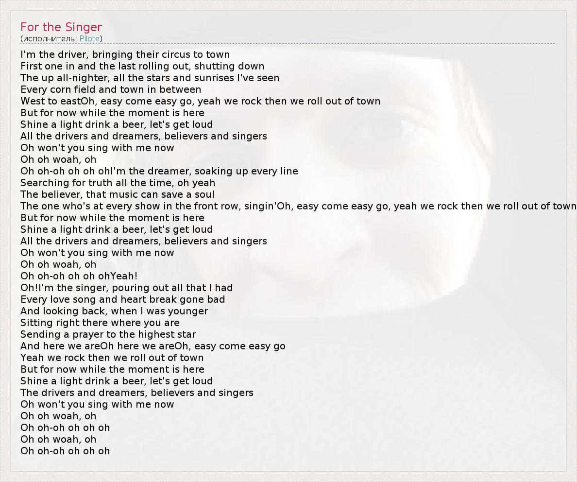 The one who's at every show in the front row, singin'Oh, easy come easy go, yeah we rock then we roll out of town