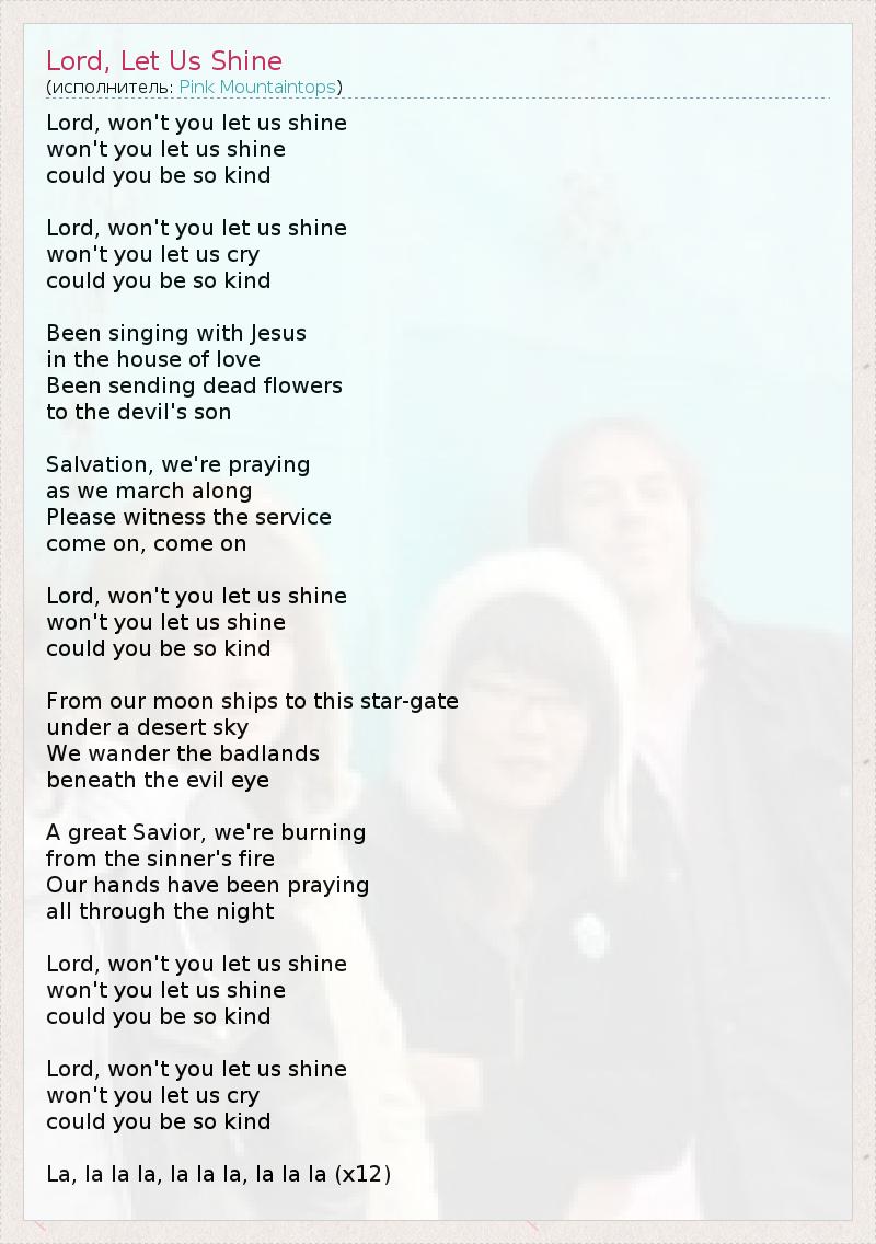 Lord, won't you let us shine won't you let us shine could you be so kind Lord, won't you let us shine won't you let us cry could you be so kind Been singing with Jesus in the house of love Been sending dead flowers to the devil's son Salvation, we're praying as we march along Please witness the service come on, come on Lord, won't you let us shine won't you let us shine could you be so kind From our moon ships to this star-gate under a desert sky We wander the badlands beneath the evil eye A great Savior, we're burning from the sinner's fire Our hands have been praying all through the night Lord, won't you let us shine won't you let us shine could you be so kind Lord, won't you let us shine won't you let us cry could you be so kind La, la la la, la la la, la la la (x12)