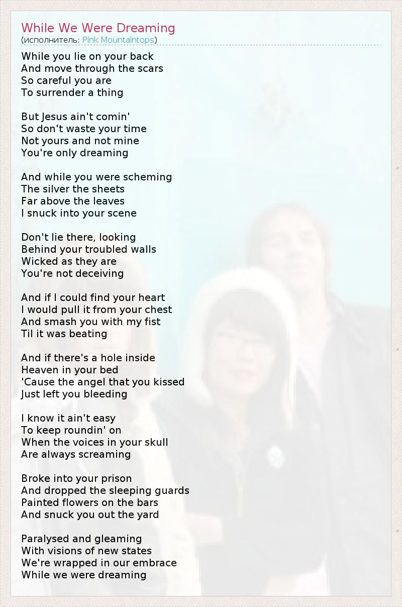 While you lie on your back And move through the scars So careful you are To surrender a thing But Jesus ain't comin' So don't waste your time Not yours and not mine You're only dreaming And while you were scheming The silver the sheets Far above the leaves I snuck into your scene Don't lie there, looking Behind your troubled walls Wicked as they are You're not deceiving And if I could find your heart I would pull it from your chest And smash you with my fist Til it was beating And if there's a hole inside Heaven in your bed 'Cause the angel that you kissed Just left you bleeding I know it ain't easy To keep roundin' on When the voices in your skull Are always screaming Broke into your prison And dropped the sleeping guards Painted flowers on the bars And snuck you out the yard Paralysed and gleaming With visions of new states We're wrapped in our embrace While we were dreaming
