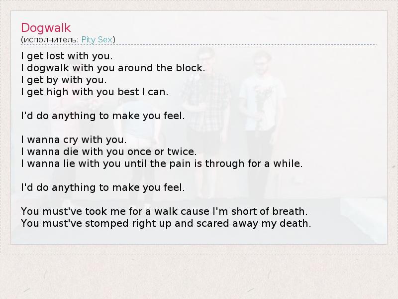 I get lost with you. I dogwalk with you around the block. I get by with you. I get high with you best I can. I'd do anything to make you feel. I wanna cry with you. I wanna die with you once or twice. I wanna lie with you until the pain is through for a while. I'd do anything to make you feel. You must've took me for a walk cause I'm short of breath. You must've stomped right up and scared away my death.