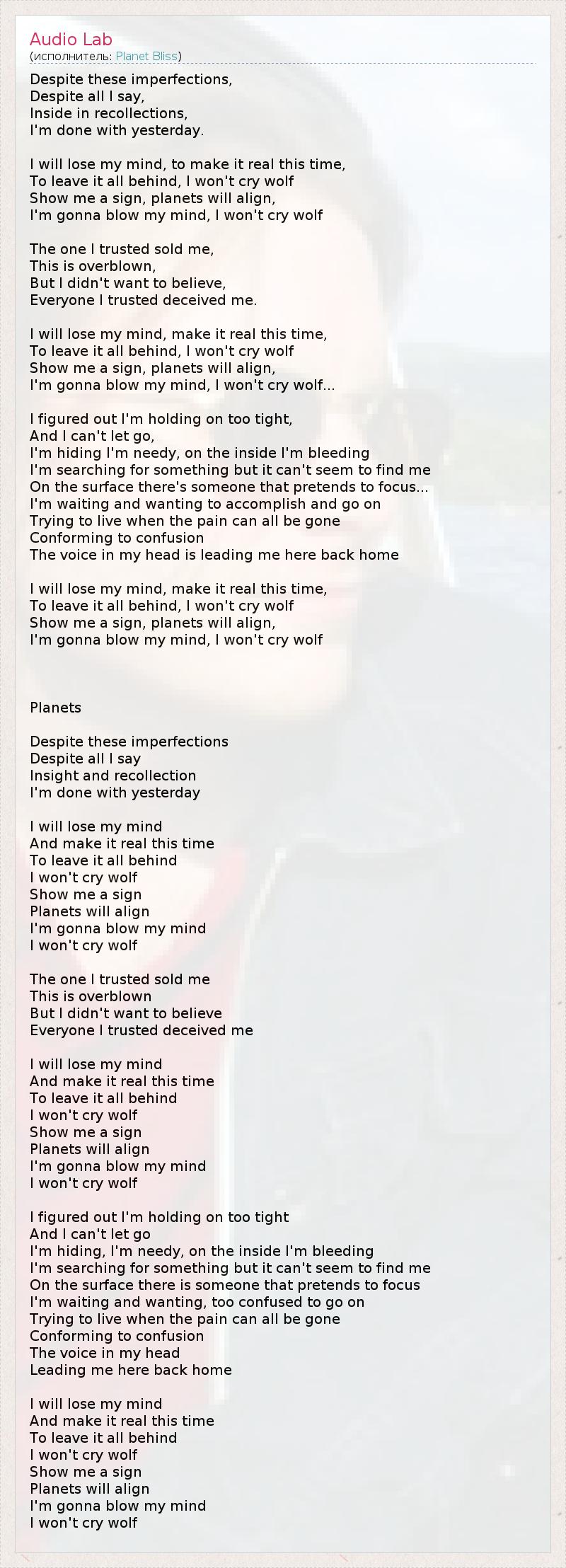 I'm gonna blow my mind, I won't cry wolf...
