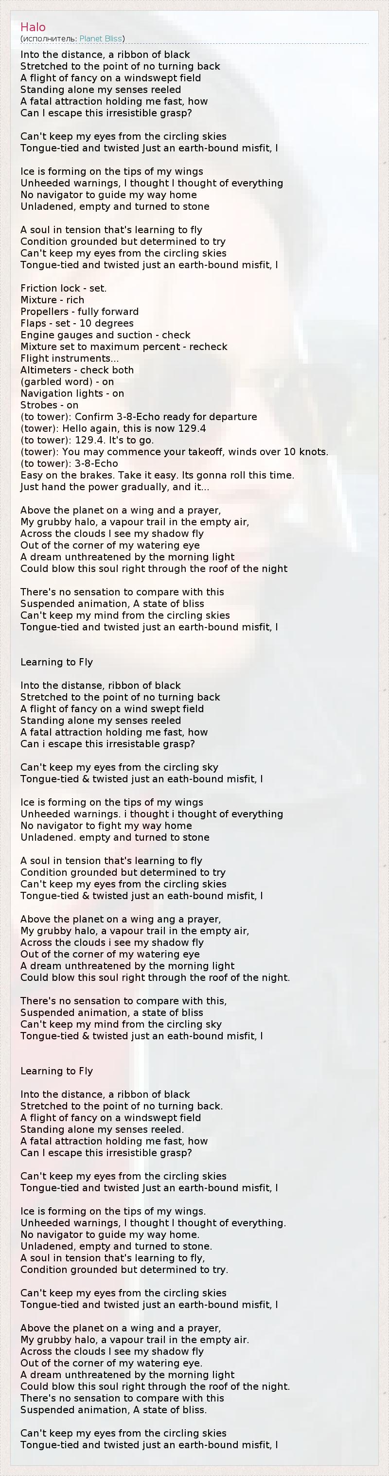 Into the distance, a ribbon of black Stretched to the point of no turning back A flight of fancy on a windswept field Standing alone my senses reeled A fatal attraction holding me fast, how Can I escape this irresistible grasp? Can't keep my eyes from the circling skies Tongue-tied and twisted Just an earth-bound misfit, I Ice is forming on the tips of my wings Unheeded warnings, I thought I thought of everything No navigator to guide my way home Unladened, empty and turned to stone A soul in tension that's learning to fly Condition grounded but determined to try Can't keep my eyes from the circling skies Tongue-tied and twisted just an earth-bound misfit, I Friction lock - set. Mixture - rich Propellers - fully forward Flaps - set - 10 degrees Engine gauges and suction - check Mixture set to maximum percent - recheck Flight instruments... Altimeters - check both (garbled word) - on Navigation lights - on Strobes - on (to tower): Confirm 3-8-Echo ready for departure (tower): Hello again, this is now 129.4 (to tower): 129.4. It's to go. (tower): You may commence your takeoff, winds over 10 knots. (to tower): 3-8-Echo Easy on the brakes. Take it easy. Its gonna roll this time. Just hand the power gradually, and it... Above the planet on a wing and a prayer, My grubby halo, a vapour trail in the empty air, Across the clouds I see my shadow fly Out of the corner of my watering eye A dream unthreatened by the morning light Could blow this soul right through the roof of the night There's no sensation to compare with this Suspended animation, A state of bliss Can't keep my mind from the circling skies Tongue-tied and twisted just an earth-bound misfit, I Learning to Fly Into the distanse, ribbon of black Stretched to the point of no turning back A flight of fancy on a wind swept field Standing alone my senses reeled A fatal attraction holding me fast, how Can i escape this irresistable grasp? Can't keep my eyes from the circling sky Tongue-tied & twisted just an eath-bound misfit, I Ice is forming on the tips of my wings Unheeded warnings. i thought i thought of everything No navigator to fight my way home Unladened. empty and turned to stone A soul in tension that's learning to fly Condition grounded but determined to try Can't keep my eyes from the circling skies Tongue-tied & twisted just an eath-bound misfit, I Above the planet on a wing ang a prayer, My grubby halo, a vapour trail in the empty air, Across the clouds i see my shadow fly Out of the corner of my watering eye A dream unthreatened by the morning light Could blow this soul right through the roof of the night. There's no sensation to compare with this, Suspended animation, a state of bliss Can't keep my mind from the circling sky Tongue-tied & twisted just an eath-bound misfit, I Learning to Fly Into the distance, a ribbon of black Stretched to the point of no turning back. A flight of fancy on a windswept field Standing alone my senses reeled. A fatal attraction holding me fast, how Can I escape this irresistible grasp? Can't keep my eyes from the circling skies Tongue-tied and twisted Just an earth-bound misfit, I Ice is forming on the tips of my wings. Unheeded warnings, I thought I thought of everything. No navigator to guide my way home. Unladened, empty and turned to stone. A soul in tension that's learning to fly, Condition grounded but determined to try. Can't keep my eyes from the circling skies Tongue-tied and twisted just an earth-bound misfit, I Above the planet on a wing and a prayer, My grubby halo, a vapour trail in the empty air. Across the clouds I see my shadow fly Out of the corner of my watering eye. A dream unthreatened by the morning light Could blow this soul right through the roof of the night. There's no sensation to compare with this Suspended animation, A state of bliss. Can't keep my eyes from the circling skies Tongue-tied and twisted just an earth-bound misfit, I