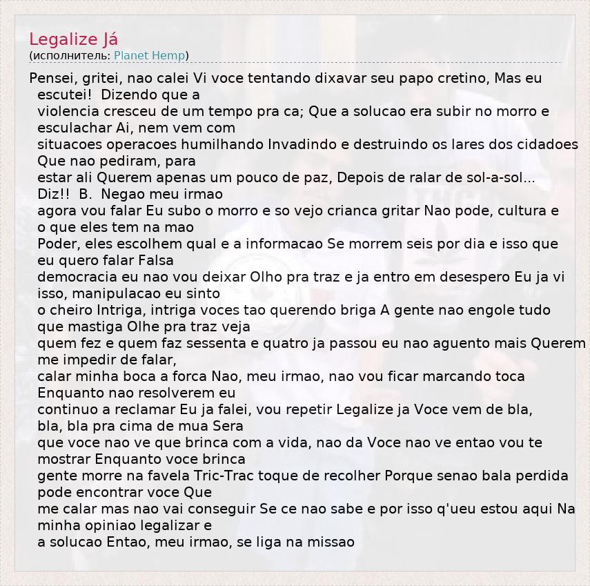 Pensei, gritei, nao calei Vi voce tentando dixavar seu papo cretino, Mas eu escutei! Dizendo que a violencia cresceu de um tempo pra ca; Que a solucao era subir no morro e esculachar Ai, nem vem com situacoes operacoes humilhando Invadindo e destruindo os lares dos cidadoes Que nao pediram, para estar ali Querem apenas um pouco de paz, Depois de ralar de sol-a-sol... Diz!! B. Negao meu irmao agora vou falar Eu subo o morro e so vejo crianca gritar Nao pode, cultura e o que eles tem na mao Poder, eles escolhem qual e a informacao Se morrem seis por dia e isso que eu quero falar Falsa democracia eu nao vou deixar Olho pra traz e ja entro em desespero Eu ja vi isso, manipulacao eu sinto o cheiro Intriga, intriga voces tao querendo briga A gente nao engole tudo que mastiga Olhe pra traz veja quem fez e quem faz sessenta e quatro ja passou eu nao aguento mais Querem me impedir de falar, calar minha boca a forca Nao, meu irmao, nao vou ficar marcando toca Enquanto nao resolverem eu continuo a reclamar Eu ja falei, vou repetir Legalize ja Voce vem de bla, bla, bla pra cima de mua Sera que voce nao ve que brinca com a vida, nao da Voce nao ve entao vou te mostrar Enquanto voce brinca gente morre na favela Tric-Trac toque de recolher Porque senao bala perdida pode encontrar voce Que me calar mas nao vai conseguir Se ce nao sabe e por isso q'ueu estou aqui Na minha opiniao legalizar e a solucao Entao, meu irmao, se liga na missao