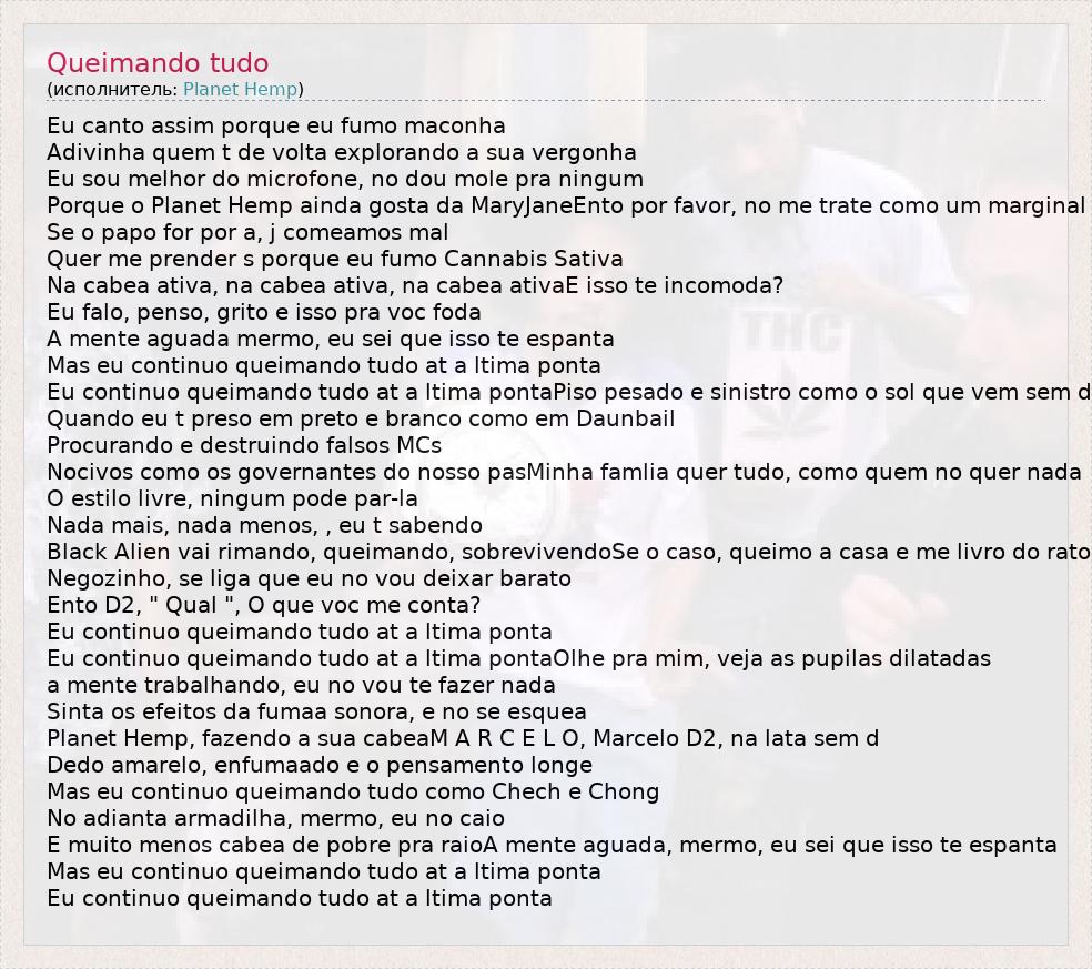 Eu canto assim porque eu fumo maconha Adivinha quem t de volta explorando a sua vergonha Eu sou melhor do microfone, no dou mole pra ningum Porque o Planet Hemp ainda gosta da MaryJaneEnto por favor, no me trate como um marginal Se o papo for por a, j comeamos mal Quer me prender s porque eu fumo Cannabis Sativa Na cabea ativa, na cabea ativa, na cabea ativaE isso te incomoda? Eu falo, penso, grito e isso pra voc foda A mente aguada mermo, eu sei que isso te espanta Mas eu continuo queimando tudo at a ltima ponta Eu continuo queimando tudo at a ltima pontaPiso pesado e sinistro como o sol que vem sem d Quando eu t preso em preto e branco como em Daunbail Procurando e destruindo falsos MCs Nocivos como os governantes do nosso pasMinha famlia quer tudo, como quem no quer nada O estilo livre, ningum pode par-la Nada mais, nada menos, , eu t sabendo Black Alien vai rimando, queimando, sobrevivendoSe o caso, queimo a casa e me livro do rato Negozinho, se liga que eu no vou deixar barato Ento D2, " Qual ", O que voc me conta? Eu continuo queimando tudo at a ltima ponta Eu continuo queimando tudo at a ltima pontaOlhe pra mim, veja as pupilas dilatadas a mente trabalhando, eu no vou te fazer nada Sinta os efeitos da fumaa sonora, e no se esquea Planet Hemp, fazendo a sua cabeaM A R C E L O, Marcelo D2, na lata sem d Dedo amarelo, enfumaado e o pensamento longe Mas eu continuo queimando tudo como Chech e Chong No adianta armadilha, mermo, eu no caio E muito menos cabea de pobre pra raioA mente aguada, mermo, eu sei que isso te espanta Mas eu continuo queimando tudo at a ltima ponta Eu continuo queimando tudo at a ltima ponta