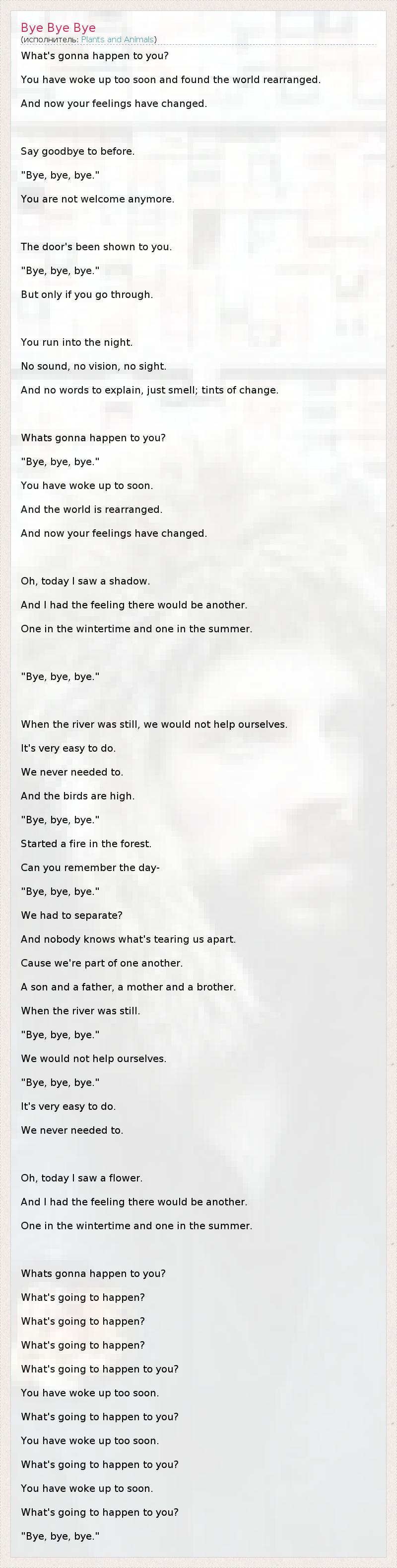 What's gonna happen to you? You have woke up too soon and found the world rearranged. And now your feelings have changed. Say goodbye to before. "Bye, bye, bye." You are not welcome anymore. The door's been shown to you. "Bye, bye, bye." But only if you go through. You run into the night. No sound, no vision, no sight. And no words to explain, just smell; tints of change. Whats gonna happen to you? "Bye, bye, bye." You have woke up to soon. And the world is rearranged. And now your feelings have changed. Oh, today I saw a shadow. And I had the feeling there would be another. One in the wintertime and one in the summer. "Bye, bye, bye." When the river was still, we would not help ourselves. It's very easy to do. We never needed to. And the birds are high. "Bye, bye, bye." Started a fire in the forest. Can you remember the day- "Bye, bye, bye." We had to separate? And nobody knows what's tearing us apart. Cause we're part of one another. A son and a father, a mother and a brother. When the river was still. "Bye, bye, bye." We would not help ourselves. "Bye, bye, bye." It's very easy to do. We never needed to. Oh, today I saw a flower. And I had the feeling there would be another. One in the wintertime and one in the summer. Whats gonna happen to you? What's going to happen? What's going to happen? What's going to happen? What's going to happen to you? You have woke up too soon. What's going to happen to you? You have woke up too soon. What's going to happen to you? You have woke up to soon. What's going to happen to you? "Bye, bye, bye."