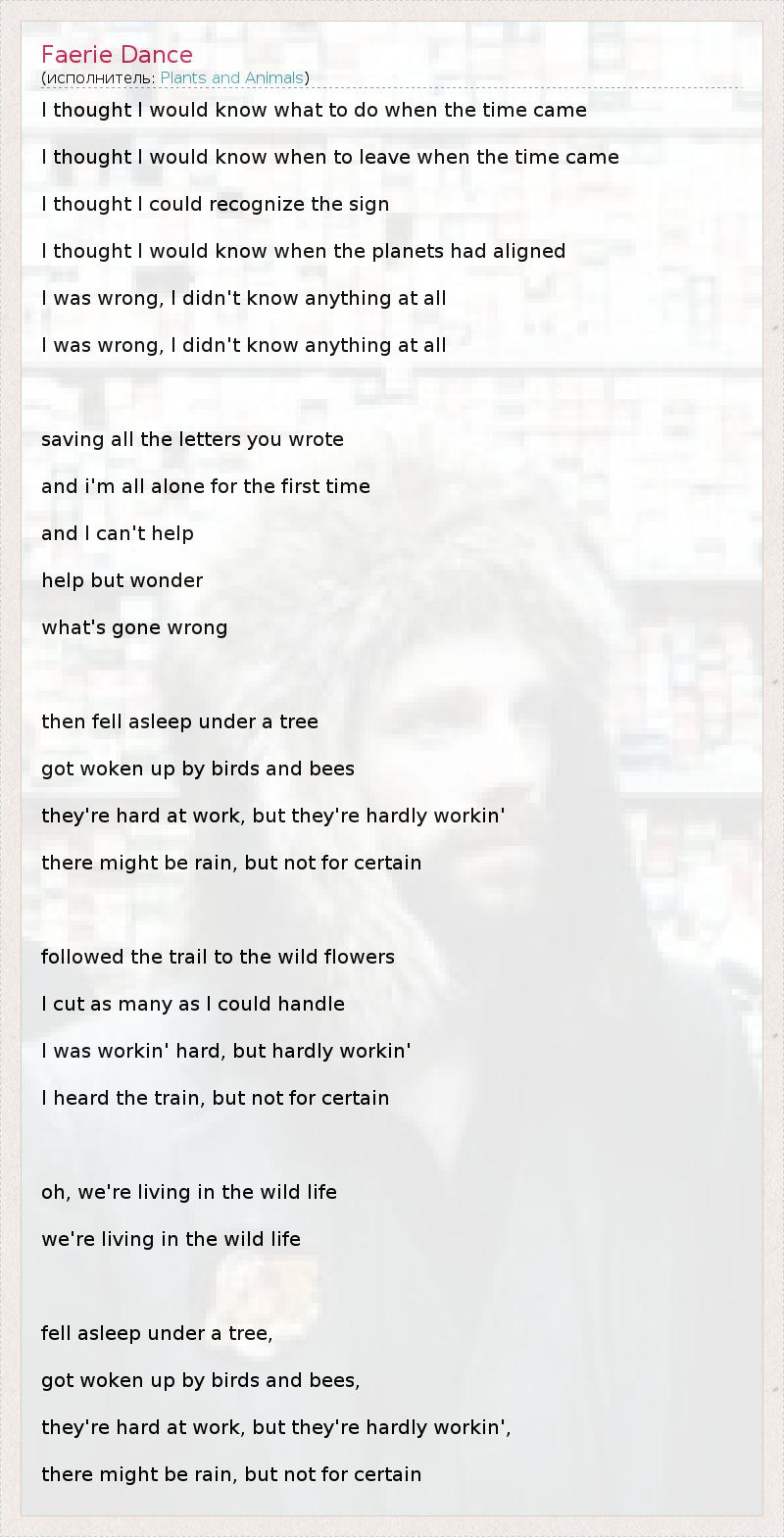 I thought I would know what to do when the time came I thought I would know when to leave when the time came I thought I could recognize the sign I thought I would know when the planets had aligned I was wrong, I didn't know anything at all I was wrong, I didn't know anything at all saving all the letters you wrote and i'm all alone for the first time and I can't help help but wonder what's gone wrong then fell asleep under a tree got woken up by birds and bees they're hard at work, but they're hardly workin' there might be rain, but not for certain followed the trail to the wild flowers I cut as many as I could handle I was workin' hard, but hardly workin' I heard the train, but not for certain oh, we're living in the wild life we're living in the wild life fell asleep under a tree, got woken up by birds and bees, they're hard at work, but they're hardly workin', there might be rain, but not for certain
