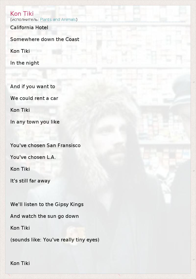California Hotel Somewhere down the Coast Kon Tiki In the night And if you want to We could rent a car Kon Tiki In any town you like You've chosen San Fransisco You've chosen L.A. Kon Tiki It's still far away We'll listen to the Gipsy Kings And watch the sun go down Kon Tiki (sounds like: You've really tiny eyes) Kon Tiki