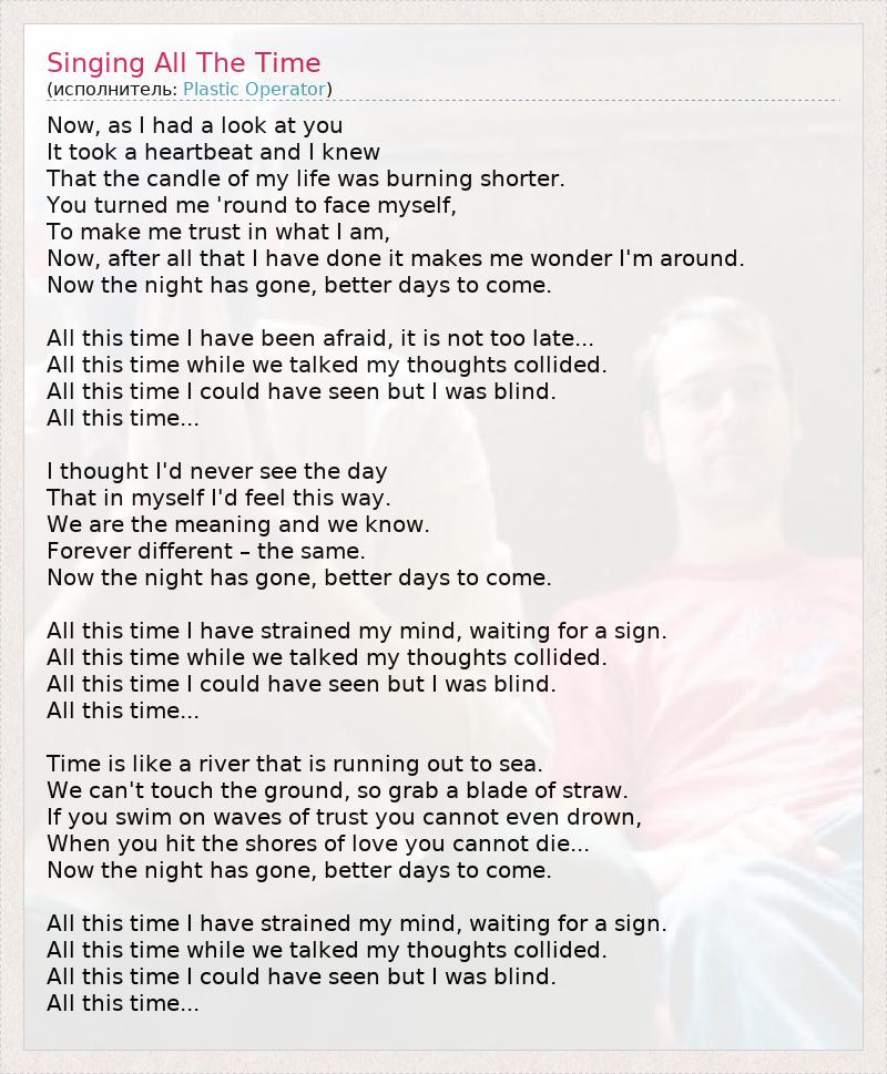 Теперь, когда я взглянул на тебя, Мое сердце замерло, и я понял, Что свеча моей жизни догорает. Ты повернула меня лицом к самому себе, Заставила меня поверить в себя. И после всего, что я сделал, удивительно, что я всё ещё здесь. И вот, ночь отступила, всё лучшее ещё впереди. Всё это время я боялся, что уже слишком поздно... Всё это время, пока мы говорили, в моей голове был беспорядок. Всё это время я мог бы видеть, но я был слеп. Всё это время... Я думал, что не доживу до дня, Когда во мне произойдут эти перемены. Смысл в нас, мы знаем. Такие разные, но так похожи. И вот, ночь отступила, всё лучшее ещё впереди. Всё это время я был в напряжении, в ожидании знака. Всё это время, пока мы говорили, в моей голове был беспорядок. Всё это время я мог бы видеть, но я был слеп. Всё это время... Время как река, которая впадает в море. Мы не можем дотянуться до дна и хватаемся за соломинку. Если ты плывешь на волнах доверия, ты не можешь утонуть, Когда ты достигнешь берега любви, ты не умрешь... И вот, ночь отступила, всё лучшее ещё впереди. Всё это время я был в напряжении, в ожидании знака. Всё это время, пока мы говорили, в моей голове был беспорядок. Всё это время я мог бы видеть, но я был слеп. Всё это время...