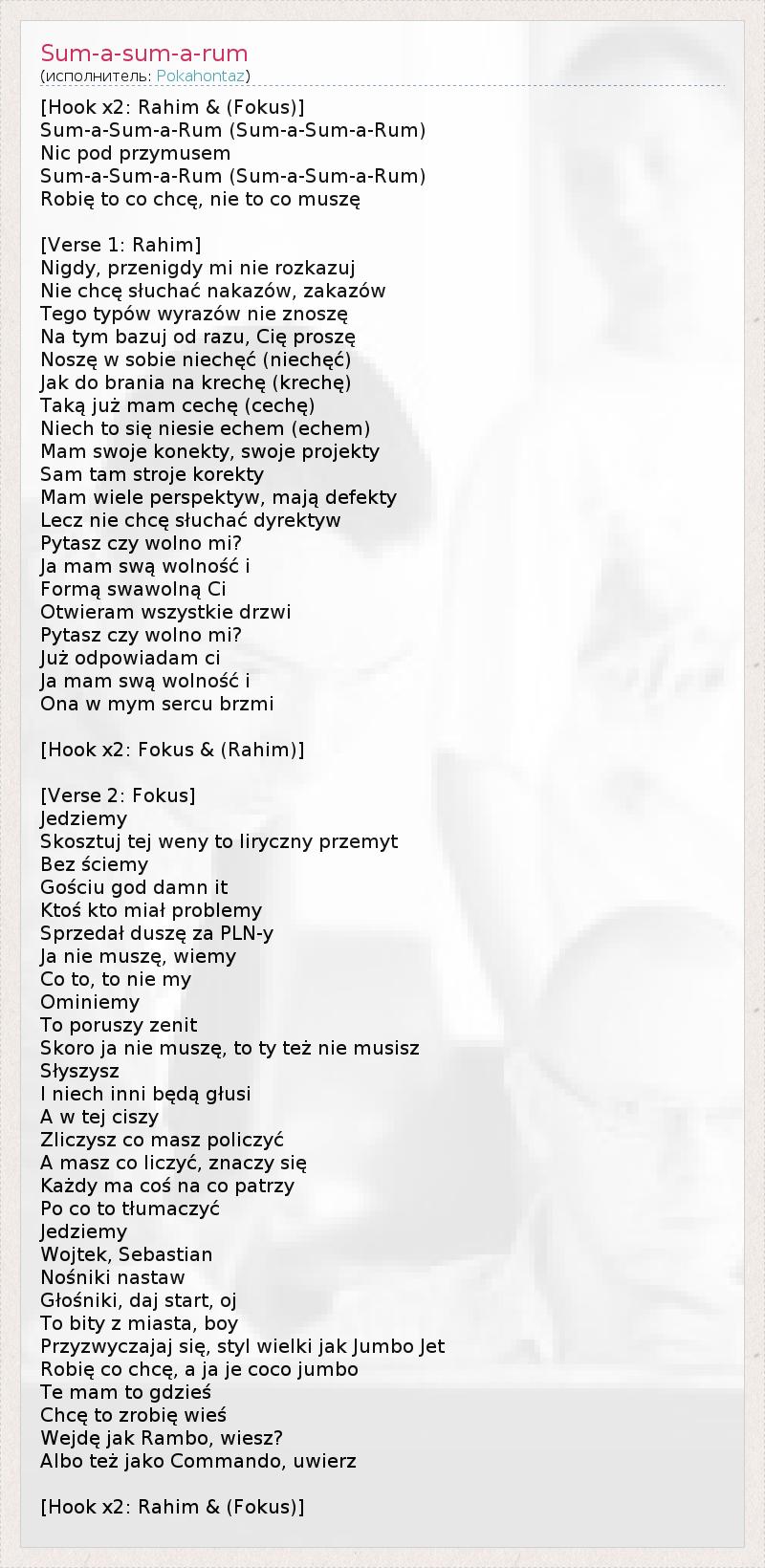 [Hook x2: Rahim & (Fokus)] Sum-a-Sum-a-Rum (Sum-a-Sum-a-Rum) Nic pod przymusem Sum-a-Sum-a-Rum (Sum-a-Sum-a-Rum) Robię to co chcę, nie to co muszę [Verse 1: Rahim] Nigdy, przenigdy mi nie rozkazuj Nie chcę słuchać nakazów, zakazów Tego typów wyrazów nie znoszę Na tym bazuj od razu, Cię proszę Noszę w sobie niechęć (niechęć) Jak do brania na krechę (krechę) Taką już mam cechę (cechę) Niech to się niesie echem (echem) Mam swoje konekty, swoje projekty Sam tam stroje korekty Mam wiele perspektyw, mają defekty Lecz nie chcę słuchać dyrektyw Pytasz czy wolno mi? Ja mam swą wolność i Formą swawolną Ci Otwieram wszystkie drzwi Pytasz czy wolno mi? Już odpowiadam ci Ja mam swą wolność i Ona w mym sercu brzmi [Hook x2: Fokus & (Rahim)] [Verse 2: Fokus] Jedziemy Skosztuj tej weny to liryczny przemyt Bez ściemy Gościu god damn it Ktoś kto miał problemy Sprzedał duszę za PLN-y Ja nie muszę, wiemy Co to, to nie my Ominiemy To poruszy zenit Skoro ja nie muszę, to ty też nie musisz Słyszysz I niech inni będą głusi A w tej ciszy Zliczysz co masz policzyć A masz co liczyć, znaczy się Każdy ma coś na co patrzy Po co to tłumaczyć Jedziemy Wojtek, Sebastian Nośniki nastaw Głośniki, daj start, oj To bity z miasta, boy Przyzwyczajaj się, styl wielki jak Jumbo Jet Robię co chcę, a ja je coco jumbo Te mam to gdzieś Chcę to zrobię wieś Wejdę jak Rambo, wiesz? Albo też jako Commando, uwierz [Hook x2: Rahim & (Fokus)]