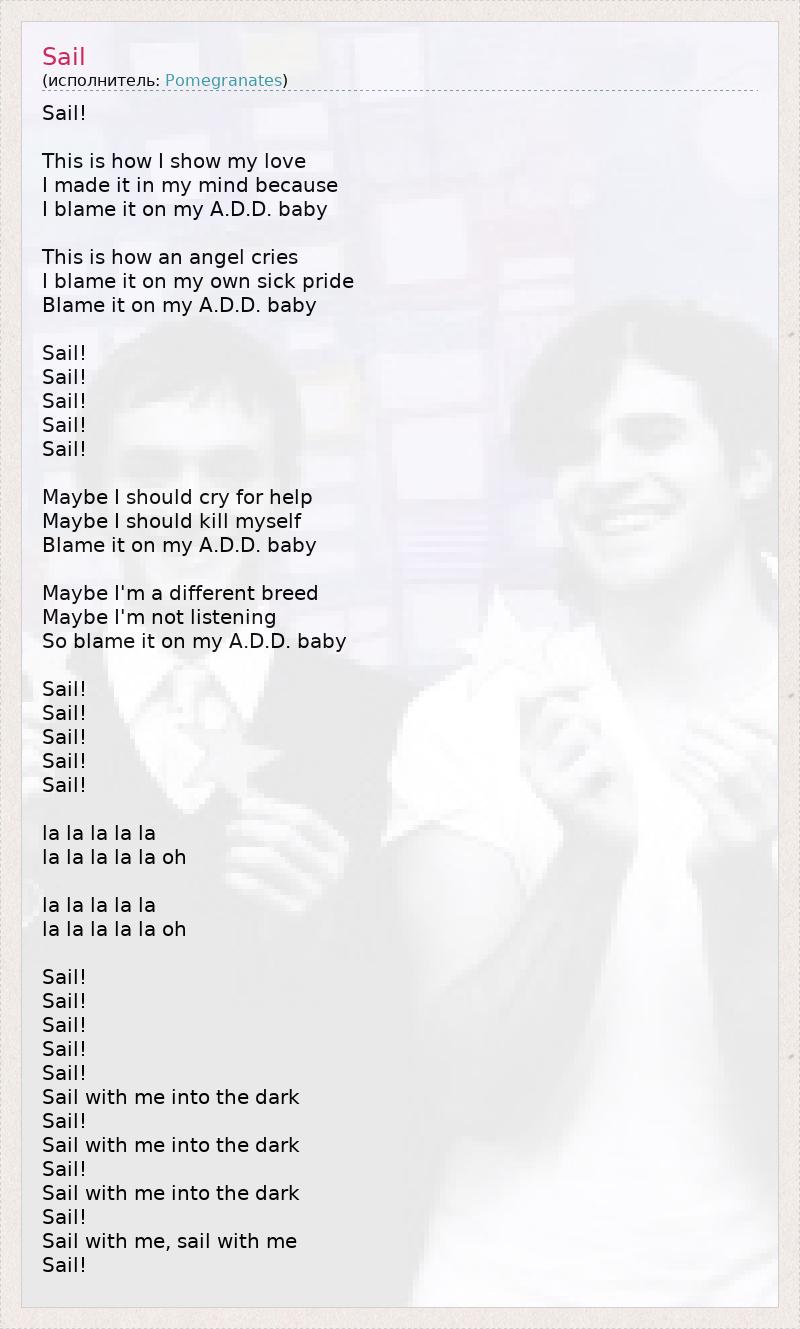 Sail! This is how I show my love I made it in my mind because I blame it on my A.D.D. baby This is how an angel cries I blame it on my own sick pride Blame it on my A.D.D. baby Sail! Sail! Sail! Sail! Sail! Maybe I should cry for help Maybe I should kill myself Blame it on my A.D.D. baby Maybe I'm a different breed Maybe I'm not listening So blame it on my A.D.D. baby Sail! Sail! Sail! Sail! Sail! la la la la la la la la la la oh la la la la la la la la la la oh Sail! Sail! Sail! Sail! Sail! Sail with me into the dark Sail! Sail with me into the dark Sail! Sail with me into the dark Sail! Sail with me, sail with me Sail!