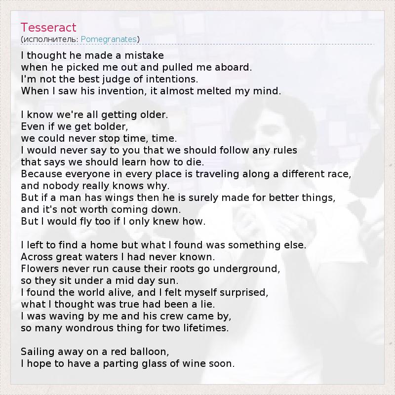 I thought he made a mistake when he picked me out and pulled me aboard. I'm not the best judge of intentions. When I saw his invention, it almost melted my mind. I know we're all getting older. Even if we get bolder, we could never stop time, time. I would never say to you that we should follow any rules that says we should learn how to die. Because everyone in every place is traveling along a different race, and nobody really knows why. But if a man has wings then he is surely made for better things, and it's not worth coming down. But I would fly too if I only knew how. I left to find a home but what I found was something else. Across great waters I had never known. Flowers never run cause their roots go underground, so they sit under a mid day sun. I found the world alive, and I felt myself surprised, what I thought was true had been a lie. I was waving by me and his crew came by, so many wondrous thing for two lifetimes. Sailing away on a red balloon, I hope to have a parting glass of wine soon.