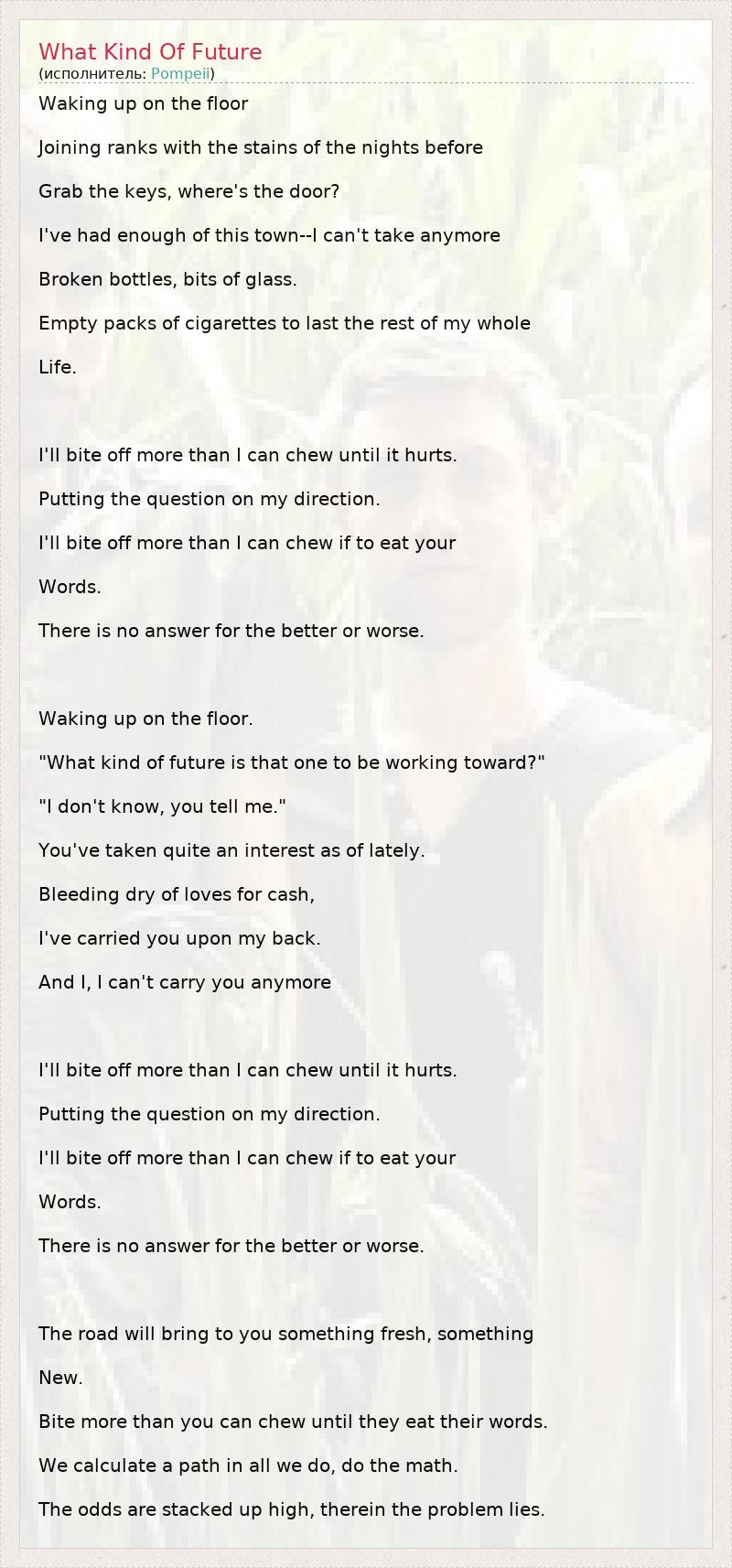 Waking up on the floor Joining ranks with the stains of the nights before Grab the keys, where's the door? I've had enough of this town--I can't take anymore Broken bottles, bits of glass. Empty packs of cigarettes to last the rest of my whole Life. I'll bite off more than I can chew until it hurts. Putting the question on my direction. I'll bite off more than I can chew if to eat your Words. There is no answer for the better or worse. Waking up on the floor. "What kind of future is that one to be working toward?" "I don't know, you tell me." You've taken quite an interest as of lately. Bleeding dry of loves for cash, I've carried you upon my back. And I, I can't carry you anymore I'll bite off more than I can chew until it hurts. Putting the question on my direction. I'll bite off more than I can chew if to eat your Words. There is no answer for the better or worse. The road will bring to you something fresh, something New. Bite more than you can chew until they eat their words. We calculate a path in all we do, do the math. The odds are stacked up high, therein the problem lies.