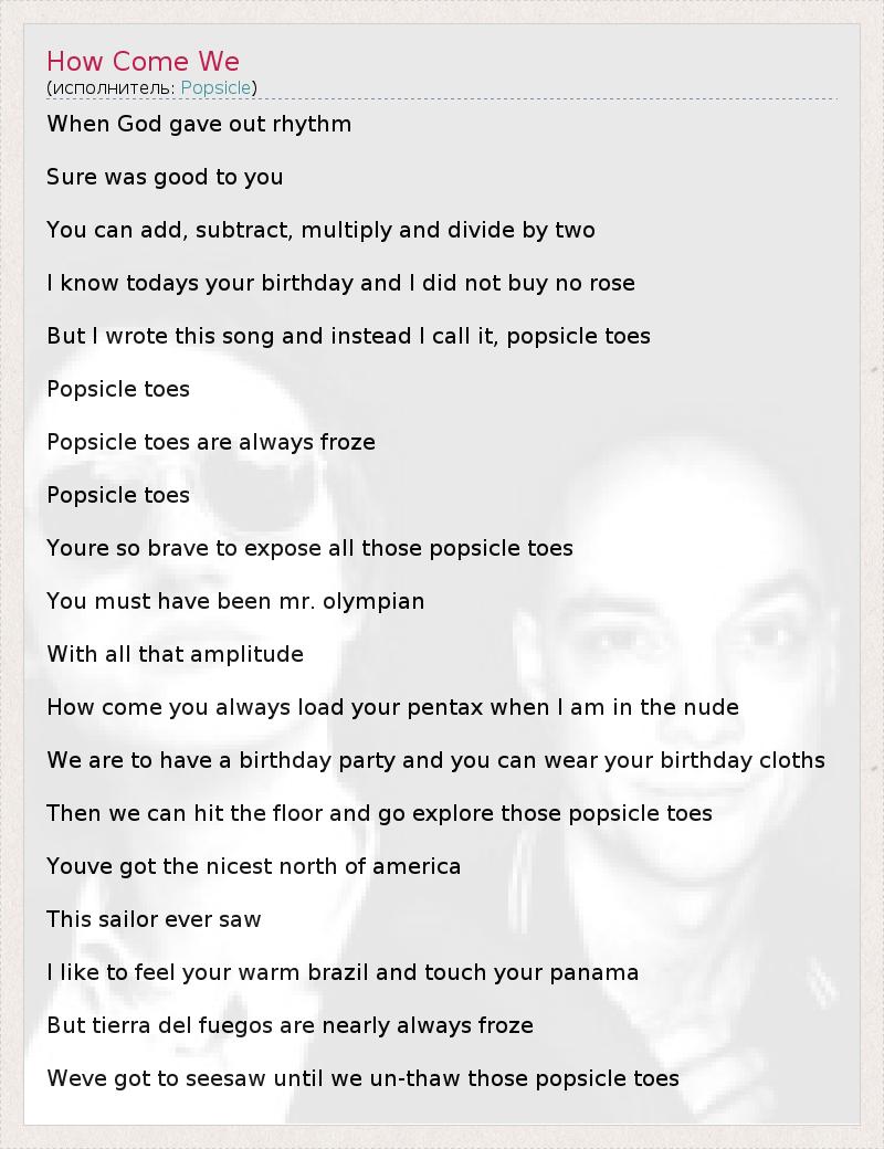 When God gave out rhythm Sure was good to you You can add, subtract, multiply and divide by two I know todays your birthday and I did not buy no rose But I wrote this song and instead I call it, popsicle toes Popsicle toes Popsicle toes are always froze Popsicle toes Youre so brave to expose all those popsicle toes You must have been mr. olympian With all that amplitude How come you always load your pentax when I am in the nude We are to have a birthday party and you can wear your birthday cloths Then we can hit the floor and go explore those popsicle toes Youve got the nicest north of america This sailor ever saw I like to feel your warm brazil and touch your panama But tierra del fuegos are nearly always froze Weve got to seesaw until we un-thaw those popsicle toes