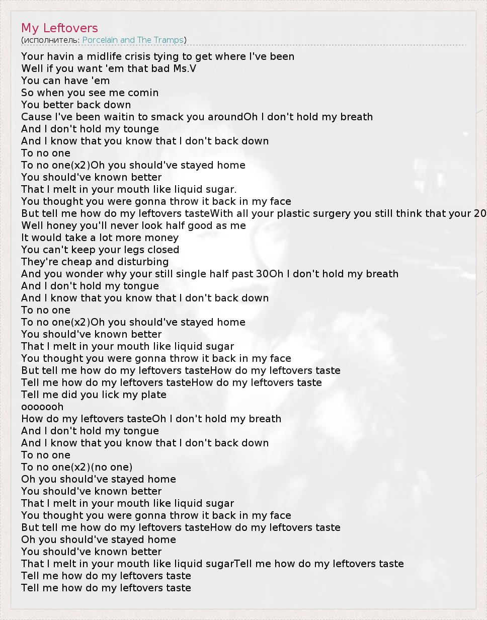 Your havin a midlife crisis tying to get where I've been Well if you want 'em that bad Ms.V You can have 'em So when you see me comin You better back down Cause I've been waitin to smack you aroundOh I don't hold my breath And I don't hold my tounge And I know that you know that I don't back down To no one To no one(x2)Oh you should've stayed home You should've known better That I melt in your mouth like liquid sugar. You thought you were gonna throw it back in my face But tell me how do my leftovers tasteWith all your plastic surgery you still think that your 20 Well honey you'll never look half good as me It would take a lot more money You can't keep your legs closed They're cheap and disturbing And you wonder why your still single half past 30Oh I don't hold my breath And I don't hold my tongue And I know that you know that I don't back down To no one To no one(x2)Oh you should've stayed home You should've known better That I melt in your mouth like liquid sugar You thought you were gonna throw it back in my face But tell me how do my leftovers tasteHow do my leftovers taste Tell me how do my leftovers tasteHow do my leftovers taste Tell me did you lick my plate ooooooh How do my leftovers tasteOh I don't hold my breath And I don't hold my tongue And I know that you know that I don't back down To no one To no one(x2)(no one) Oh you should've stayed home You should've known better That I melt in your mouth like liquid sugar You thought you were gonna throw it back in my face But tell me how do my leftovers tasteHow do my leftovers taste Oh you should've stayed home You should've known better That I melt in your mouth like liquid sugarTell me how do my leftovers taste Tell me how do my leftovers taste Tell me how do my leftovers taste