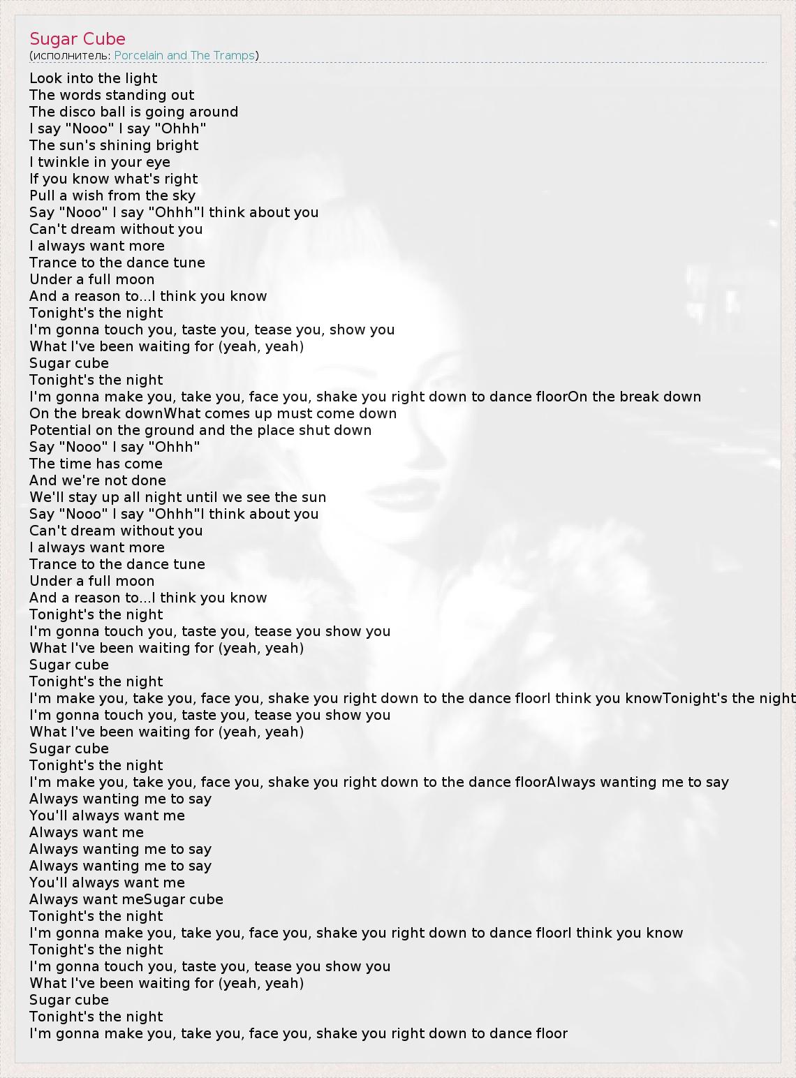 Look into the light The words standing out The disco ball is going around I say "Nooo" I say "Ohhh" The sun's shining bright I twinkle in your eye If you know what's right Pull a wish from the sky Say "Nooo" I say "Ohhh"I think about you Can't dream without you I always want more Trance to the dance tune Under a full moon And a reason to...I think you know Tonight's the night I'm gonna touch you, taste you, tease you, show you What I've been waiting for (yeah, yeah) Sugar cube Tonight's the night I'm gonna make you, take you, face you, shake you right down to dance floorOn the break down On the break downWhat comes up must come down Potential on the ground and the place shut down Say "Nooo" I say "Ohhh" The time has come And we're not done We'll stay up all night until we see the sun Say "Nooo" I say "Ohhh"I think about you Can't dream without you I always want more Trance to the dance tune Under a full moon And a reason to...I think you know Tonight's the night I'm gonna touch you, taste you, tease you show you What I've been waiting for (yeah, yeah) Sugar cube Tonight's the night I'm make you, take you, face you, shake you right down to the dance floorI think you knowTonight's the night I'm gonna touch you, taste you, tease you show you What I've been waiting for (yeah, yeah) Sugar cube Tonight's the night I'm make you, take you, face you, shake you right down to the dance floorAlways wanting me to say Always wanting me to say You'll always want me Always want me Always wanting me to say Always wanting me to say You'll always want me Always want meSugar cube Tonight's the night I'm gonna make you, take you, face you, shake you right down to dance floorI think you know Tonight's the night I'm gonna touch you, taste you, tease you show you What I've been waiting for (yeah, yeah) Sugar cube Tonight's the night I'm gonna make you, take you, face you, shake you right down to dance floor