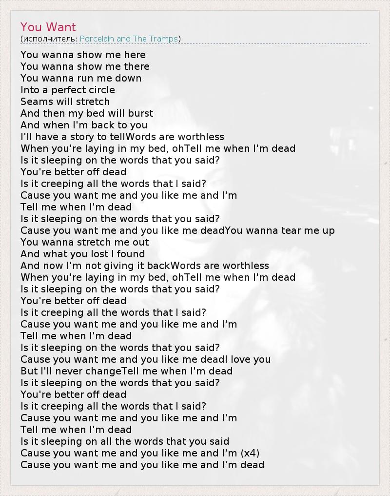 You wanna show me here You wanna show me there You wanna run me down Into a perfect circle Seams will stretch And then my bed will burst And when I'm back to you I'll have a story to tellWords are worthless When you're laying in my bed, ohTell me when I'm dead Is it sleeping on the words that you said? You're better off dead Is it creeping all the words that I said? Cause you want me and you like me and I'm Tell me when I'm dead Is it sleeping on the words that you said? Cause you want me and you like me deadYou wanna tear me up You wanna stretch me out And what you lost I found And now I'm not giving it backWords are worthless When you're laying in my bed, ohTell me when I'm dead Is it sleeping on the words that you said? You're better off dead Is it creeping all the words that I said? Cause you want me and you like me and I'm Tell me when I'm dead Is it sleeping on the words that you said? Cause you want me and you like me deadI love you But I'll never changeTell me when I'm dead Is it sleeping on the words that you said? You're better off dead Is it creeping all the words that I said? Cause you want me and you like me and I'm Tell me when I'm dead Is it sleeping on all the words that you said Cause you want me and you like me and I'm (x4) Cause you want me and you like me and I'm dead