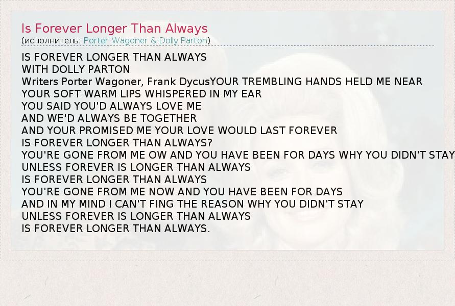 IS FOREVER LONGER THAN ALWAYS WITH DOLLY PARTON Writers Porter Wagoner, Frank DycusYOUR TREMBLING HANDS HELD ME NEAR YOUR SOFT WARM LIPS WHISPERED IN MY EAR YOU SAID YOU'D ALWAYS LOVE ME AND WE'D ALWAYS BE TOGETHER AND YOUR PROMISED ME YOUR LOVE WOULD LAST FOREVER IS FOREVER LONGER THAN ALWAYS? YOU'RE GONE FROM ME OW AND YOU HAVE BEEN FOR DAYS WHY YOU DIDN'T STAY UNLESS FOREVER IS LONGER THAN ALWAYS IS FOREVER LONGER THAN ALWAYS YOU'RE GONE FROM ME NOW AND YOU HAVE BEEN FOR DAYS AND IN MY MIND I CAN'T FING THE REASON WHY YOU DIDN'T STAY UNLESS FOREVER IS LONGER THAN ALWAYS IS FOREVER LONGER THAN ALWAYS.