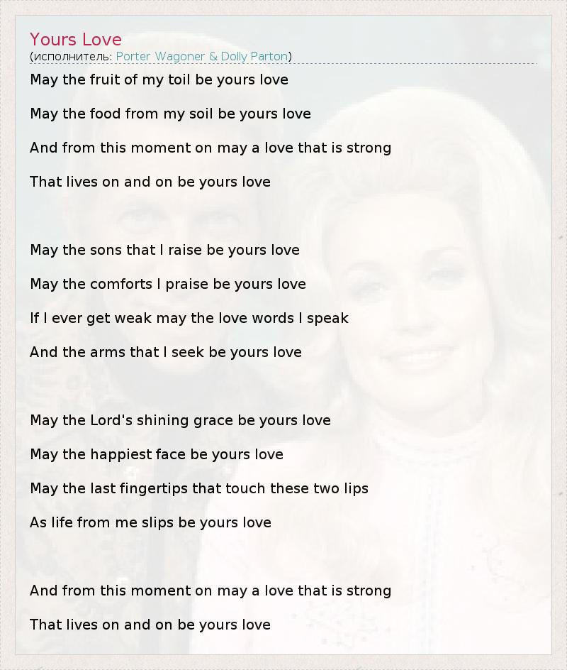 May the fruit of my toil be yours love May the food from my soil be yours love And from this moment on may a love that is strong That lives on and on be yours love May the sons that I raise be yours love May the comforts I praise be yours love If I ever get weak may the love words I speak And the arms that I seek be yours love May the Lord's shining grace be yours love May the happiest face be yours love May the last fingertips that touch these two lips As life from me slips be yours love And from this moment on may a love that is strong That lives on and on be yours love