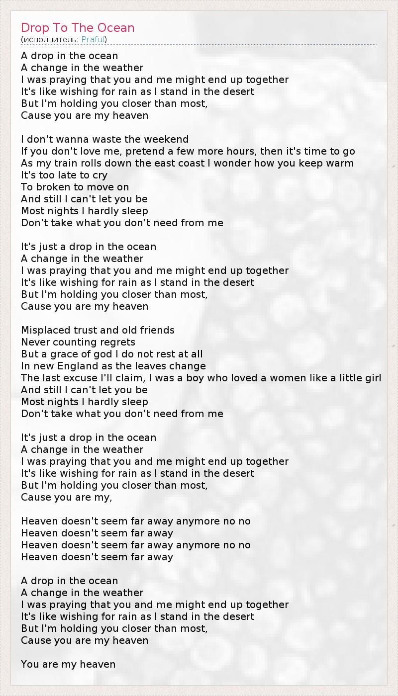 Капля в океане, Смена погоды. Я молился о том, чтобы ты и я в итоге были вместе - Это словно мечтать о дожде посреди пустыни. Но я крепче всего держу тебя в своих объятиях, Потому что ты - мое небо. Я не хочу тратить впустую выходные дни. Если ты не любишь меня, То просто притворись ещё на несколько часов, а затем Настанет время уходить. Пока мой поезд катится к восточному побережью, Мне хочется знать, как же ты согреваешься. Слишком поздно плакать, Я слишком разбит, чтобы продолжать двигаться дальше. И все же я не могу отпустить тебя. Большинство ночей я почти не смыкаю глаз. Не пытайся найти то, что тебе от меня не нужно. Это всего лишь капля в океане, Смена погоды. Я молился о том, чтобы ты и я в итоге были вместе - Это словно мечтать о дожде посреди пустыни. Но я крепче всего держу тебя в своих объятиях, Потому что ты - мое небо. Неуместное доверие и старые друзья, Никогда не считаю извинения. По милости Божией я совсем не даю себе покоя. В Новой Англии,* когда листья меняют окраску, Я потребую последнего оправдания. Я был парнем, влюбленным в Женщину, которая вела себя, словно маленькая девочка. И все же я не могу отпустить тебя. Большинство ночей я почти не смыкаю глаз. Не пытайся найти то, что тебе от меня не нужно. Это всего лишь капля в океане, Смена погоды. Я молился о том, чтобы ты и я в итоге были вместе - Это словно мечтать о дожде посреди пустыни. Но я крепче всего держу тебя в своих объятиях, Потому что ты - мое... Небо, оно больше не кажется мне далеким, нет, нет. Небо не кажется мне далеким. Небо больше не кажется мне далеким, нет, нет. Небо не кажется мне далеким. Капля в океане, Смена погоды. Я молился о том, чтобы ты и я в итоге были вместе - Это словно мечтать о дожде посреди пустыни. Но я крепче всего держу тебя в своих объятиях, Потому что ты - мое небо. Ты - мое небо.