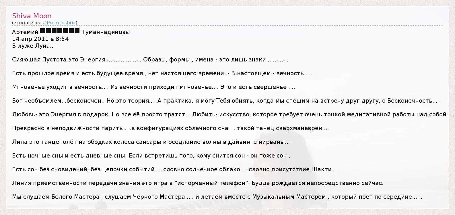 Artemy गोविन्द Tumannadyantszy April 14, 2011 at 8:54 am In a puddle Moon ... Emptiness is Shining Energy ..................... images , shapes, names - it only marks ........... A past time and a future time , no date. - The present - an eternity ..... Moment of eternity ... Of eternity comes a moment ... This is the fulfillment. .. God neobemlem ... endless .. But this theory ... A practice: I can give you a hug when we are anxious to meet each other , to Infinity .... Love is the energy of a gift. But just spend all her ... Love , an art that requires very fine meditative work on themselves. .. Perfectly motionless soar ... Sleep cloud configurations . sverhmanevren dance .. such ... Leela is tantsepolet on the rims and wheel of samsara osedlanie wave diving nirvana ... There are nightly dreams and there are day dreams. If you meet the one who has a dream - he too is a dream . There dreamless sleep , without a chain of events ... like solar cloud ... if the presence of Shakti ... Line of continuity of knowledge transfer is a game of " broken telephone " . Buddha is born directly now . We listen to the White Wizard , Black Wizard listening .... and fly with the musical artist who sings in the middle ....
